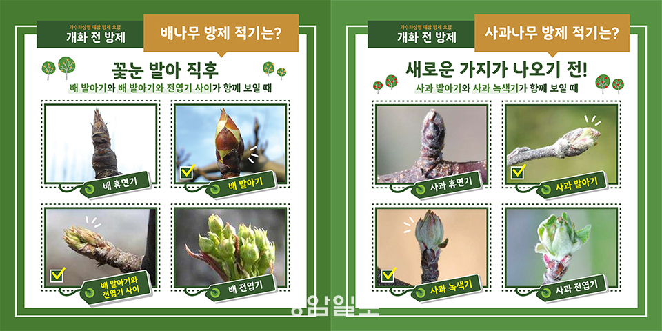 ±ºÀº ¹èÀÇ °æ¿ì ¹ß¾Æ±â¿Í Àü¿±±â »çÀÌÀÎ 3¿ù 19ÀÏ ~ 3¿ù 25ÀÏ, »ç°ú´Â ¹ß¾Æ±â¿Í ³ì»ö±â »çÀÌÀÎ 3¿ù 28ÀÏ ~ 3¿ù 31ÀÏ ±îÁö¸¦ °³È Àü ¹æÁ¦ Àû±â·Î ¼³Á¤ÇßÀ¸¸ç, ¹æÁ¦´ë»óÀÎ ¹è‧»ç°ú Àç¹è ³ó°¡¿¡¼´Â °ø±ÞµÈ ¾àÁ¦¸¦ ÇØ´ç °úÁ¾º° ¹æÁ¦Àû±â¿¡ ¹Ýµå½Ã »ìÆ÷ÇØ¾ß ÇÑ´Ù.