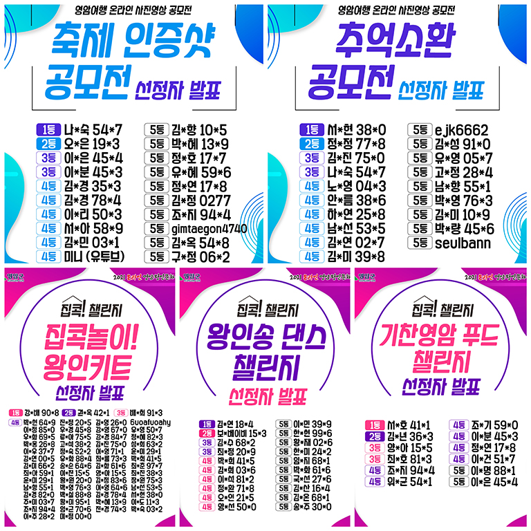 ¶ÇÇÑ, ¡®±âÂù¿µ¾Ï Ǫµå 縰Áö¡¯´Â ¿µ¾Ï ³ó¡¤Æ¯»ê¹°À» ÀÌ¿ë ÀÚÃë¿ä¸®, Ä·Çο丮 °æ¿µ´ëȸ·Î ±¸¼ºµÆÀ¸¸ç ¡®¿µ¾Ï¿©Çà ¿Â¶óÀÎ »çÁø¡¤¿µ»ó °ø¸ðÀü¡¯Àº ¿Â¶óÀÎ ¿µ¾Ï¿ÕÀι®ÈÃàÁ¦¸¦ Áñ±â´Â ¸ð½À°ú Áö³ ÃàÁ¦¿ÍÀÇ Ãß¾ïÀ» ÀÚ¶ûÇÏ´Â ÄÜÅÙÃ÷·Î ÃàÁ¦ ÇÁ·Î±×·¥ Âü¿© ÀÎÁõ¼¦ À̺¥Æ®¿Í ¿ª´ë ¿ÕÀι®ÈÃàÁ¦ Ãß¾ï ¼Òȯ À̺¥Æ®·Î ±¸¼ºÇÏ´Â µî ´Ù¾çÇÑ ÇÁ·Î±×·¥µéÀÌ ºñ´ë¸é ÃàÁ¦ÀÇ ÁöÆòÀ» ¿¾ú´Ù´Â È£ÆòÀ» ¹Þ¾Ò´Ù.