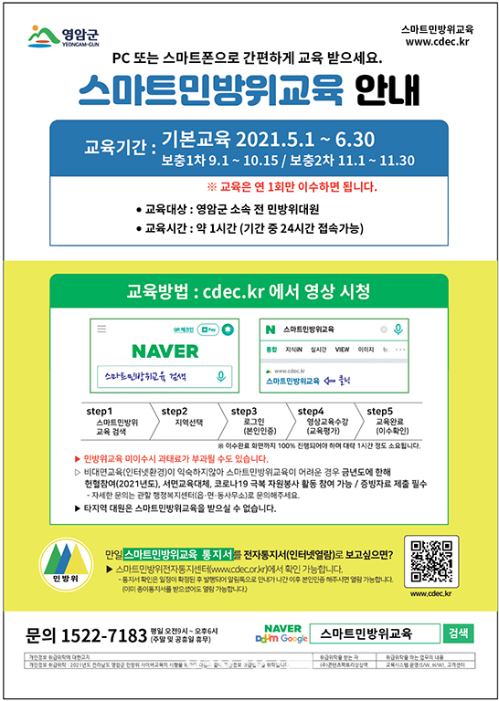»çÀ̹ö±³À°Àº 1½Ã°£ µ¿¾È ÁøÇàµÇ¸ç, ¿µ¾Ï±º ¼Ò¼Ó ¹Î¹æÀ§´ë¿øÀÌ¸é ´©±¸³ª PC¿Í ½º¸¶Æ®Æù(¾ÆÀÌÆù Æ÷ÇÔ)À» ÀÌ¿ëÇØ ½º¸¶Æ® ¹Î¹æÀ§±³À°»çÀÌÆ®(http://www.cedc.kr)¿¡¼ º»ÀÎÀÎÁõÀ» °ÅÃÄ ±³À°À» ¹ÞÀ» ¼ö ÀÖ´Ù.