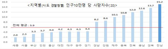 ÀÌ °°Àº »ç¸ÁÀÚ ºñÀ²Àº Àü±¹ 17°³ ±¤¿ª½Ã¡¤µµ °¡¿îµ¥ °¡Àå ³ôÀº ¼öÄ¡´Ù. ÀÌ¾î °æºÏ 13.7¸í, Ãæ³² 12.6¸í, ÀüºÏ 12.0¸í, ÃæºÏ 10.8¸í, Á¦ÁÖ 10.1¸í µîÀÇ ¼øÀ̾úÀ¸¸ç ±¤ÁÖ´Â 4.3¸í¿¡ ±×ÃÆ´Ù.