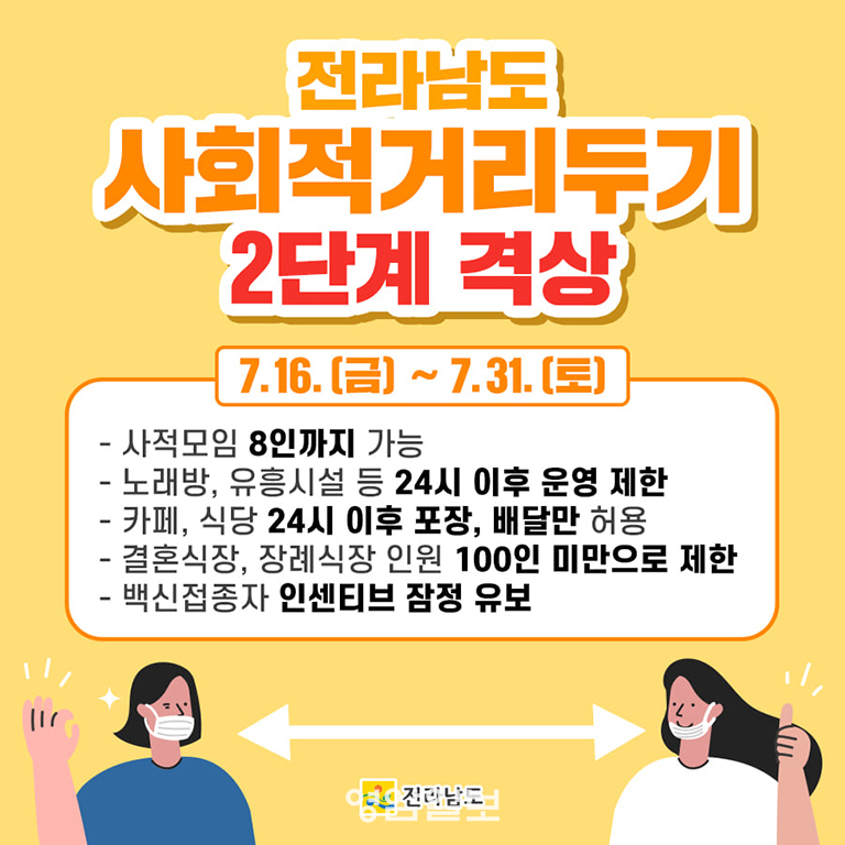 Àü³²µµ´Â ÃÖ±Ù Äڷγª19 È®ÁøÀÚ°¡ ±Þ°ÝÈ÷ Áõ°¡ÇÔ¿¡ µû¶ó 16ÀϺÎÅÍ 31ÀϱîÁö ´ÙÁßÀÌ¿ë½Ã¼³ ¿µ¾÷½Ã°£À» 24½Ã±îÁö Á¦ÇÑÇϰí, °áÈ¥½Ä․Àå·Ê½ÄÀå 100¸í ÀÌ»ó ÁýÇÕÀ» ±ÝÁöÇÏ´Â µî »çȸÀû °Å¸®µÎ±â¸¦ 2´Ü°è·Î °Ý»óÇÑ´Ù°í ¹àÇû´Ù.