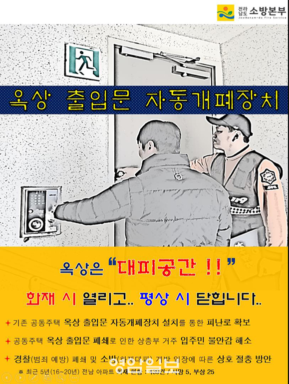¼Ò¹æ¼ °ü°èÀÚ´Â ¡°¿Á»ó ÃâÀÔ¹®¿¡ ÀÚµ¿°³ÆóÀåÄ¡¸¦ ¼³Ä¡ÇÔÀ¸·Î¼ ¹æ¹ü¹®Á¦ ÇØ°á°ú µ¿½Ã¿¡ È¿À²ÀûÀÎ ºñ»ó±¸ °ü¸®, ÈÀç¹ß»ý ¶§ ÀÔÁÖ¹ÎÀÇ ¾ÈÀü±îÁö ¸ðµÎ È®º¸ ÇÒ ¼ö ÀÖ´Â ¸¸Å ÀÚµ¿°³ÆóÀåÄ¡¸¦ ÀÚÀ²ÀûÀ¸·Î ¼³Ä¡ÇÒ ¼ö ÀÖµµ·Ï °øµ¿ÁÖÅà °ü°èÀںе鿡°Ô Àû±Ø È«º¸ Çϰڴ١±°í ¸»Çß´Ù.