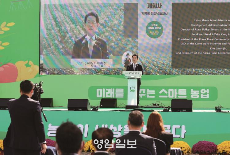 °³¸·½Ä¿¡´Â ±è¿µ·Ï Àü³²µµÁö»ç, ±èÇÑÁ¾ µµÀÇȸÀÇÀå, Àå¼®¿õ µµ±³À°°¨, ±è½Â³² ±¹È¸ÀÇ¿ø µîÀÌ Âü¼®ÇØ 2021±¹Á¦³ó¾÷¹Ú¶÷ȸ ¼º°ø °³ÃÖ¸¦ ÀÀ¿øÇß´Ù. ¡®³ó¾÷ÀÌ ¼¼»óÀ» ¹Ù²Û´Ù- ¹Ì·¡¸¦ ²Þ²Ù´Â ½º¸¶Æ® ³ó¾÷¡¯À» ÁÖÁ¦·Î 11Àϰ£ ¿¸°´Ù. ¹Ú¶÷ȸ ȨÆäÀÌÁö¿Í ¡®À¸¶äÀü³²Æ©ºê¡¯¸¦ ÅëÇØ ¿Â¶óÀÎÀ¸·Î »ýÁß°èÇÑ Çà»ç´Â ¡®Àü³²µµ¸³±¹¾Ç´Ü¡¯°ú Å©·Î½º¿À¹ö ¹ÂÁ÷ ±×·ì ¡®¿Àµå¾ÆÀÌ¡¯ÀÇ ½ÄÀü °ø¿¬, È«º¸´ë»ç ¹è¾ÆÇö ¾¾ÀÇ ½Å¸í³ª´Â Æ®·ÎÆ® ÃàÇϰø¿¬, 2021³âÀ» ½º¸¶Æ® ³ó¾÷ Á¤Âø ¿ø³âÀ¸·Î ¼±Æ÷ÇÏ´Â °³¸· ¼¼¸®¸Ó´Ï ¼øÀ¸·Î ÁøÇàÇß´Ù.