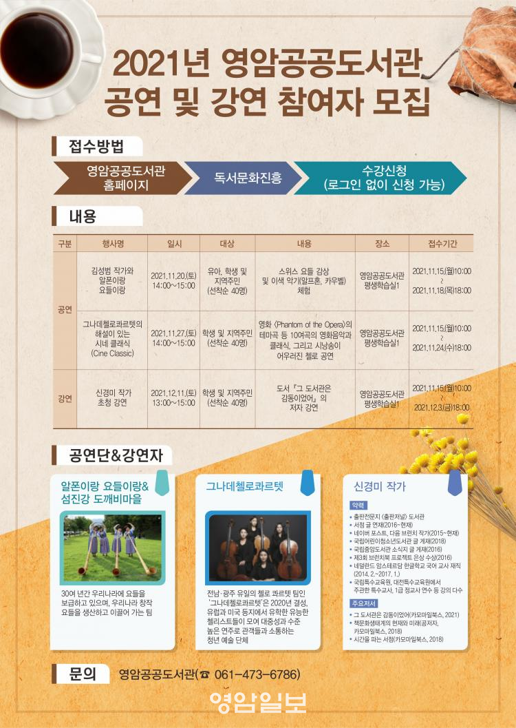 ¸ðµç °ø¿¬ ¹× °¿¬Àº ¿Â¶óÀÎ ¼±Âø¼ø Á¢¼ö·Î ÁøÇàµÇ¸ç, ±âŸ¹®ÀÇ »çÇ×Àº ¿µ¾Ï°ø°øµµ¼°ü(¢Ï061-473-6786)À¸·Î ¹®ÀÇÇÏ¸é µÈ´Ù.
