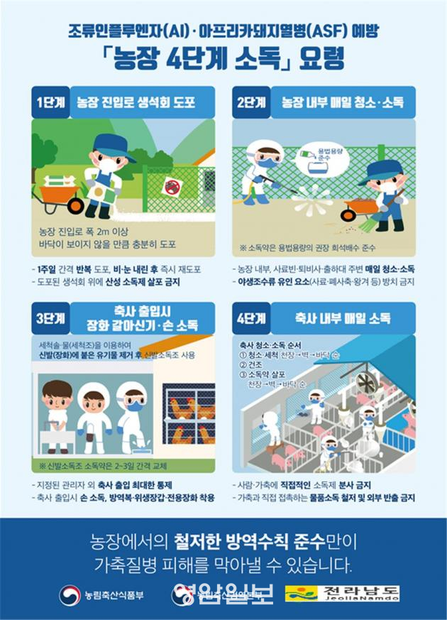 ÀüµµÇö Àü³²µµ µ¿¹°¹æ¿ª°úÀåÀº ¡°³óÀå ÁÖº¯¿¡ ±¤¹üÀ§ÇÏ°Ô ¹ÙÀÌ·¯½º°¡ ¿À¿°µÈ »óȲ¿¡¼ Ãß°¡ ¹ß»ý ¹× ÀüÆÄ ¹æÁö¸¦ À§Çؼ± ³óÀåÁÖÀÇ ±âº»¹æ¿ª¼öÄ¢ ÀÌÇàÀÌ Áß¿äÇÏ´Ù¡±¸ç ¡°°¡±Ý ³ó°¡¿¡¼´Â ÃâÀÔÂ÷·® ¼Òµ¶, ³óÀå ¸¶´ç ¹× Ãà»ç ³»ºÎ ¸ÅÀÏ ¼Òµ¶, Ãà»ç ÃâÀÔ ½Ã ÀåÈ °¥¾Æ½Å±â¡¤¼Õ¼Òµ¶ µî ³óÀå 4´Ü°è ¼Òµ¶À» öÀúÈ÷ ÇØ¾ß ÇÑ´Ù¡±°í ´çºÎÇß´Ù.