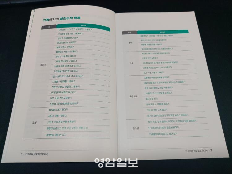 ¼¼ ¹øÂ° ¼ö¼ÛºÐ¾ß¿¡¼´Â °³Àοë ÀÚ°¡¿ë ´ë½Å ´ëÁß±³Åë ÀÌ¿ëÇϱâ, °¡±î¿î °Å¸®´Â °È°Å³ª ÀÚÀü°Å ÀÌ¿ëÇϱâÀ̸ç, ³× ¹øÂ° ÀÚ¿ø¼øÈ¯ ºÐ¾ß¿¡¼´Â ÀçȰ¿ëÀ» À§ÇÑ ºÐ¸®¹èÃâ ½ÇõÇϱâ, Á¾ÀÌŸ¿ù, ÇÚµåµå¶óÀÌ ´ë½Å °³ÀÎ ¼Õ¼ö°Ç »ç¿ëÇϱâ, Àå¹Ù±¸´Ï ÀÌ¿ëÇÏ°í ºñ´Ò »ç¿ëÁÙÀ̱â, ÀÏȸ¿ë ÄÅ ´ë½Å ´Ùȸ¿ë ÄÅ »ç¿ëÇϱâ, ¹°Æ¼½´ ´ú ¾²±â, À½½Ä Æ÷Àå ½Ã 1ȸ¿ëǰ ÁÙÀ̱âÀ̸ç, ¸¶Áö¸· Èí¼ö¿ø ºÐ¾ß¿¡¼´Â ±â³äÀÏ¿¡ ³»(°¡Á·)³ª¹« ½É¾îº¸±â, »êºÒ ¿¹¹æ, »ê¸²ÈÑ¼Õ ¹æÁö µîÀ¸·Î »ê¸²º¸È£ µî ź¼Ò Èí¼ö¿ø Á߿伺À» ¾Ë°í º¸È£Çϱ⠵îÀ¸·Î ¼ö·ÏµÇ¾ú´Ù.