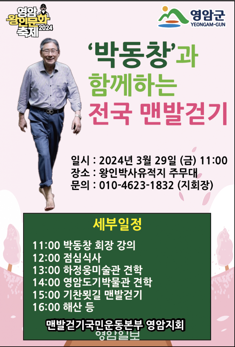 ±×°¡ ÁÖµµÇÏ´Â ¸Ç¹ß°È±â ±¹¹Î¿îµ¿º»ºÎ´Â ÇöÀç, ȸ¿ø 3¸¸¸í¿¡ ´ÞÇϰí, Àü±¹ 100¿© °³ÀÇ Áöȸ¡¤ÁöºÎ°¡ ÀÖ¾î Á¤±â ¸Ç¹ß°È±â¸¦ ÁøÇàÇϰí ÀÖ´Ù. ¹Ú ȸÀåÀº Çà»çÀå¿¡¼ ¸Ç¹ß °È±âÀÇ È¿°ú¿Í Áñ°Å¿ò, ¾ÈÀüÇÏ°Ô °È´Â ¹ý µîÀ» ¾Ë¸®°í, Âü°¡ÀÚµé°ú º¢²É ¸¸¹ßÇÑ ±âÂù¹¤±æÀ» °ÉÀ» ¿¹Á¤ÀÌ´Ù. Áö³ÇØ ¿µ¾Ï±ºÀº ¿ÕÀιڻçÀ¯ÀûÁö¿¡ 500m, ±âÂù¹¤±æ¿¡ 660mÀÇ È²Åä ¸Ç¹ß°È±â±æÀ» Á¶¼ºÇß´Ù. ¸Ç¹ß°È±â´Â µû·Î ½Åû ¾øÀÌ ´çÀÏ ¿ÀÀü 11½Ã¿¡ ¿ÕÀι®ÈÃàÁ¦Àå ÁÖ ¹«´ë·Î ¿À¸é Âü¿©ÇÒ ¼ö ÀÖ´Ù.