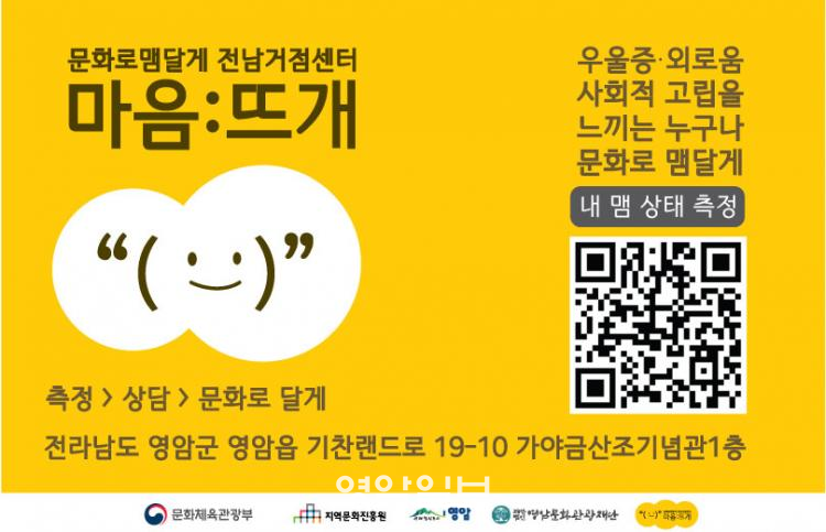¹®È·Î »çȸ¿¬´ë »ç¾÷Àº ¹®ÈüÀ°°ü±¤ºÎ¿Í Áö¿ª¹®ÈÁøÈï¿ø ÁÖÃÖ·Î Àü³²°ÅÁ¡¼¾ÅÍ´Â ¿µ¾Ï±º °¡¾ß±Ý »êÁ¶±â³ä°ü 1Ãþ¿¡ ¸¶À½ ½°ÅÍ<¸¶À½¶ß°³> °ø°£À» Á¶¼ºÇÏ¿© ¸¶À½ÀÌ ¿ïÀûÇϰųª ¿Ü·Ó°í »çȸÀûÀ¸·Î °í¸³µÈ ºÐµéÀ» ´ë»óÀ¸·Î ¸¶À½ ÃøÁ¤ ÈÄ °á°ú¿¡ µû¸¥ ¹®È·Î ¸É´Þ°Ô(¹®È·Î ¸¶À½ ´Þ·¡´Â) ÇÁ·Î±×·¥À» ¿î¿µÇÑ´Ù.