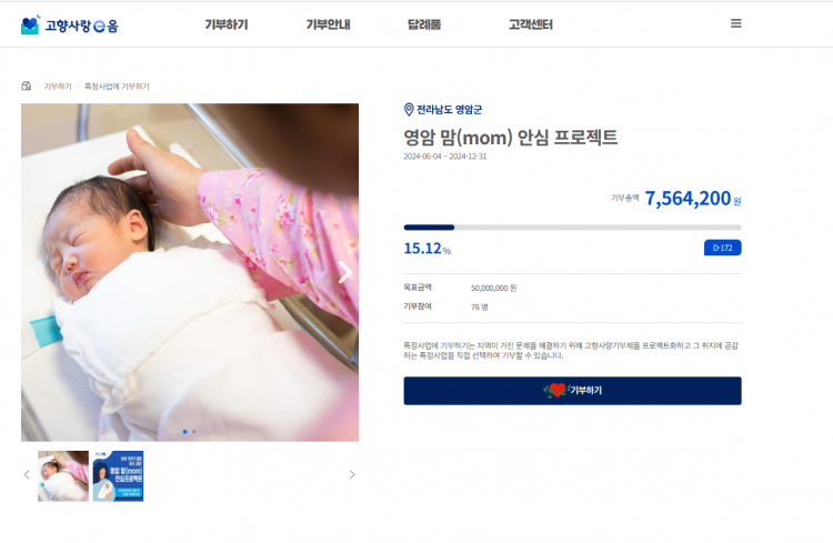 Áö³´Þ 4ÀϺÎÅÍ ±âºÎ±ÝÀ» ¹Þ´Â ¡®°íÇâ»ç¶ûeÀ½¡¯ »çÀÌÆ®¿¡¼ ¡®¿µ¾Ï ¸¾(mom) ¾È½É ÇÁ·ÎÁ§Æ®¡¯ ÁöÁ¤±âºÎ¸¦ ½ÃÀÛÇØ 76°Ç¿¡ 750¸¸¿ø°¡·® ¸ð±ÝÇß´Ù.