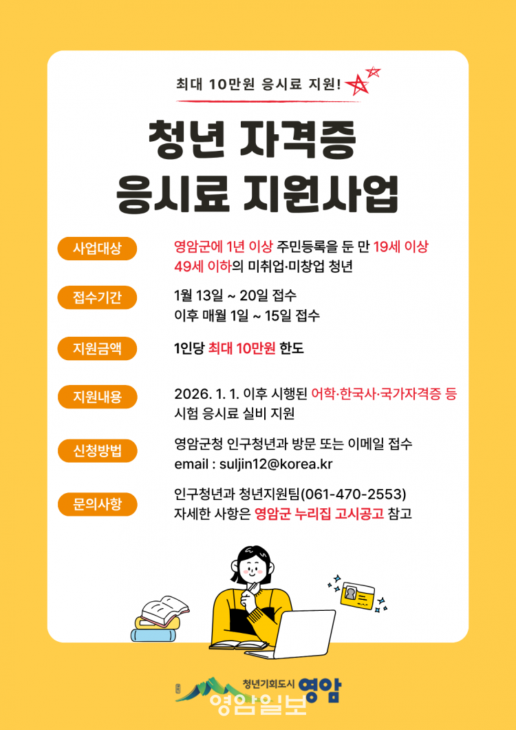 û³â ÀÚ°ÝÁõ ÀÀ½Ã·á Áö¿ø»ç¾÷ÀÇ ÀÚ¼¼ÇÑ ³»¿ëÀº ¿µ¾Ï±º ȨÆäÀÌÁö ¡®°í½Ã¡¤°ø°í¡¯¶õ¿¡¼ º¼ ¼ö ÀÖ°í, ¾È³»´Â ¿µ¾Ï±º Àα¸Ã»³â°ú û³âÁö¿øÆÀ(061-470-2553)¿¡¼ ÇÑ´Ù.