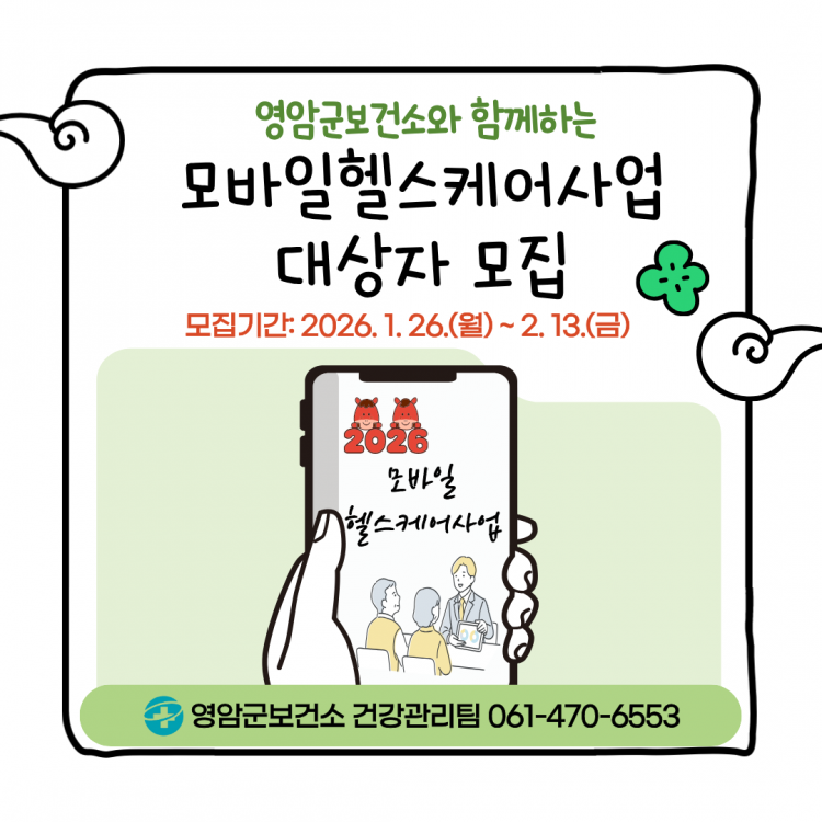 ¸ð¹ÙÀÏ ÇコÄÉ¾î »ç¾÷ Âü¿© ½ÅûÀº ¿µ¾Ï±ºº¸°Ç¼Ò °Ç°°ü¸®ÆÀ ¹æ¹® ¹× ÀüÈ(061-470-6553)·Î ÇÒ ¼ö ÀÖ´Ù.
