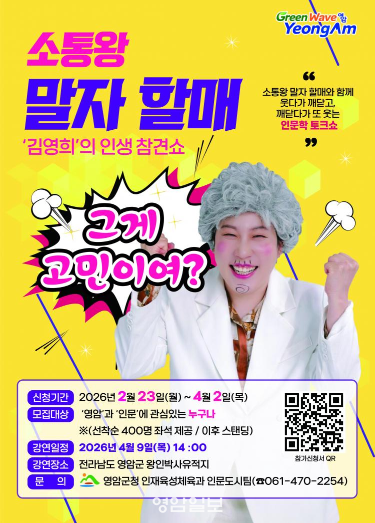 ¿µ¾Ï±ºÀº ¿À´Â 4¿ù 9ÀÏ ¡¸¸»ÀÚÇҸŠ¡®±è¿µÈñ¡¯ÀÇ ÀλýÂü°ß¼î-±×°Ô °í¹ÎÀÌ¿©?¡¹¸¦ °³ÃÖÇØ ÀÏ»ó ¼Ó °í¹ÎÀ» À¯ÄèÇÏ°Ô Ç®¾îº¸´Â ½Ã°£À» ¸¶·ÃÇÑ´Ù°í ¹àÇû´Ù. À̹ø °¿¬Àº Àι®ÇÐÀ» º¸´Ù ½±°í Ä£±ÙÇÏ°Ô Á¢ÇÒ ¼ö ÀÖµµ·Ï ±âȹµÈ ÇÁ·Î±×·¥À¸·Î, º½Ã¶ Áö¿ª ÃàÁ¦ ±â°£°ú ¸Â¹°·Á Çà»çÀåÀ» ãÀº °ü¶÷°´µéµµ ÇÔ²² Áñ±æ ¼ö ÀÖµµ·Ï Çß´Ù.