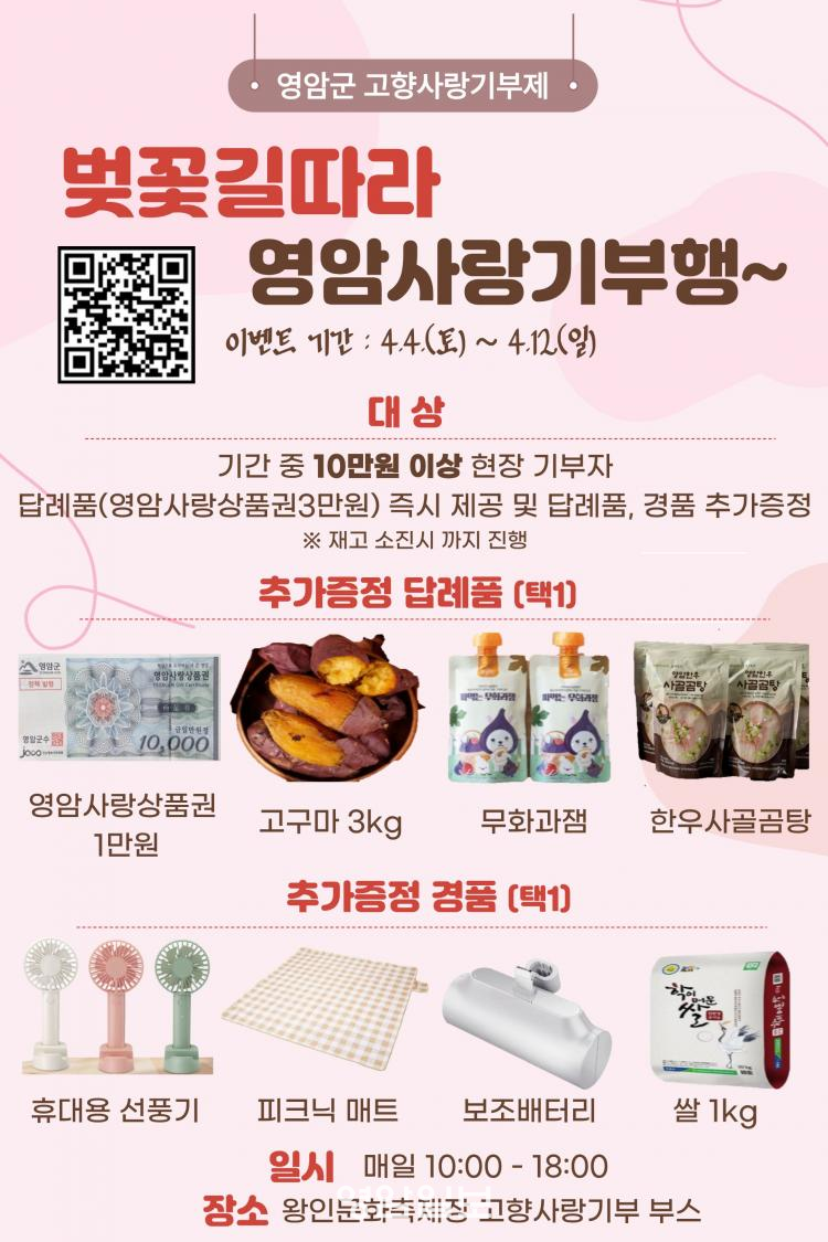ÀÌ¿Í ÇÔ²² ÃàÁ¦ ±â°£ÀÎ 4¿ù 4ÀϺÎÅÍ 12ÀϱîÁö ÃàÁ¦Àå ³» °íÇâ»ç¶û±âºÎ ºÎ½º¿¡¼´Â ÇöÀå ±âºÎ À̺¥Æ®µµ ¿î¿µµÈ´Ù. ÇöÀå¿¡¼ ±âºÎ¿¡ Âü¿©ÇÒ °æ¿ì ±âÁ¸ ´ä·Êǰ¿¡ ´õÇØ Ãß°¡ ÁõÁ¤Ç°À» ¹ÞÀ» ¼ö ÀÖ´Ù.
