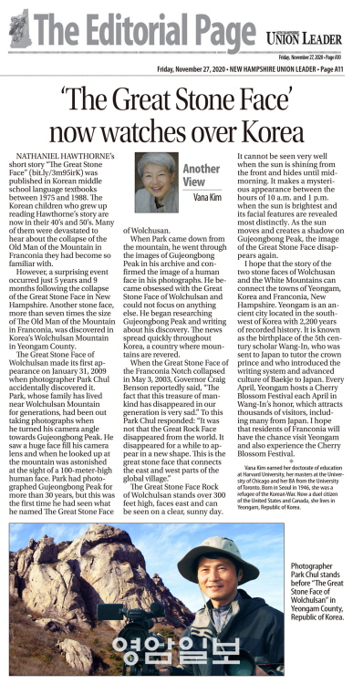 ±è ¹Ú»ç´Â µÎ °÷ÀÇ Å«¹ÙÀ§¾ó±¼¿¡ °üÇÑ ÀÚ½ÅÀÇ »ý°¢À» ´ºÇÜÇÁ¼ÅÁÖ ÃÖ´ë Àϰ£Áö À¯´Ï¾ð¸®´õ(Union Leader)¿¡ ±â°íÇß°í, Áö³ ´Þ 27ÀÏ 'The Great Stone Face now watches over Korea'(Å«¹ÙÀ§¾ó±¼ÀÌ ÀÌÁ¦ ´ëÇѹα¹À» Áö۰í ÀÖ´Ù)¶õ Á¦¸ñÀ¸·Î ½Ç¸®°Ô µÈ °ÍÀÌ´Ù.
