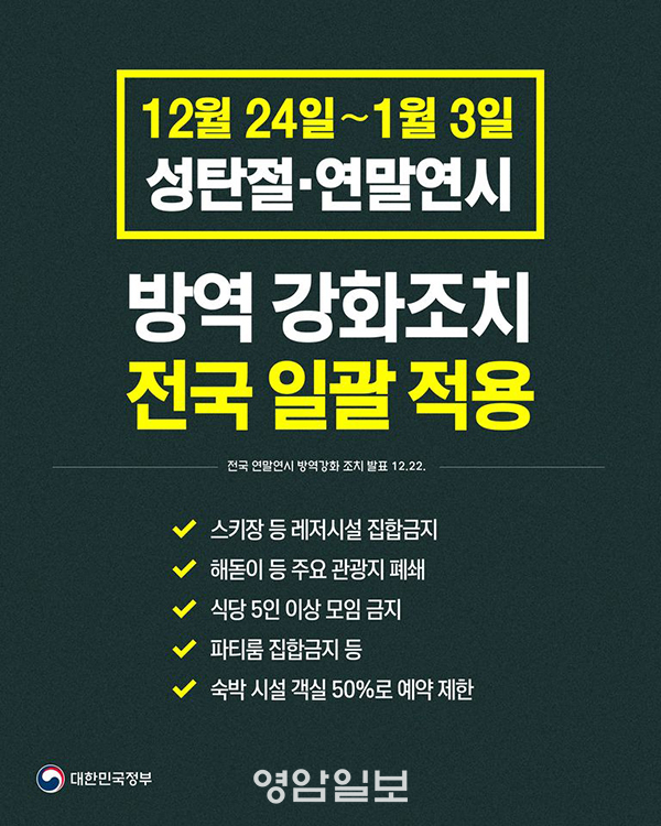 Àü³²µµ¿¡ µû¸£¸é Á¤ºÎ´Â 24ÀϺÎÅÍ ³»³â 1¿ù 3ÀϱîÁö Àü±¹ °íÀ§Çè½Ã¼³°ú ¸ðÀÓ¡¤ÆÄƼ ¹× °ü±¤¡¤¿©Çà µî¿¡ ´ëÇØ ¿¬¸»¿¬½Ã ¹æ¿ª°È Ưº°´ëÃ¥À» ½ÃÇàŰ·Î ÇßÀ¸¸ç, ÀÌ ´ëÃ¥Àº Àü±¹ ¸ðµç Áö¿ª¿¡ µ¿½Ã Àû¿ëµÈ´Ù.