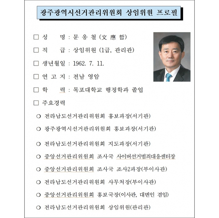 ½ÅÀÓ ¹®ÀÀö »óÀÓÀ§¿øÀº Àü³² ¿µ¾Ï Ãâ½ÅÀ¸·Î ¸ñÆ÷´ëÇб³ ÇàÁ¤Çаú¸¦ Á¹¾÷ÇßÀ¸¸ç, Áß¾Ó¼±°üÀ§ »çÀ̹ö¼±°Å¹üÁË´ëÀÀ¼¾ÅÍÀ塤Á¶»ç2°úÀå, Àü³²¼±°üÀ§ »ç¹«Ã³Àå, Áß¾Ó¼±°üÀ§ È«º¸±¹Àå, Àü³²¼±°üÀ§ »óÀÓÀ§¿øÀ» °ÅÃÆÀ¸¸ç, µû¶æÇÑ ¼ºÇ°À» °¡Áø ¼±°ÅÀü¹®°¡·Î¼ Á÷¿øµé·ÎºÎÅÍ µÎÅÍ¿î ½Å¸ÁÀ» ¹Þ°í ÀÖ´Ù°í ÀüÇÑ´Ù.