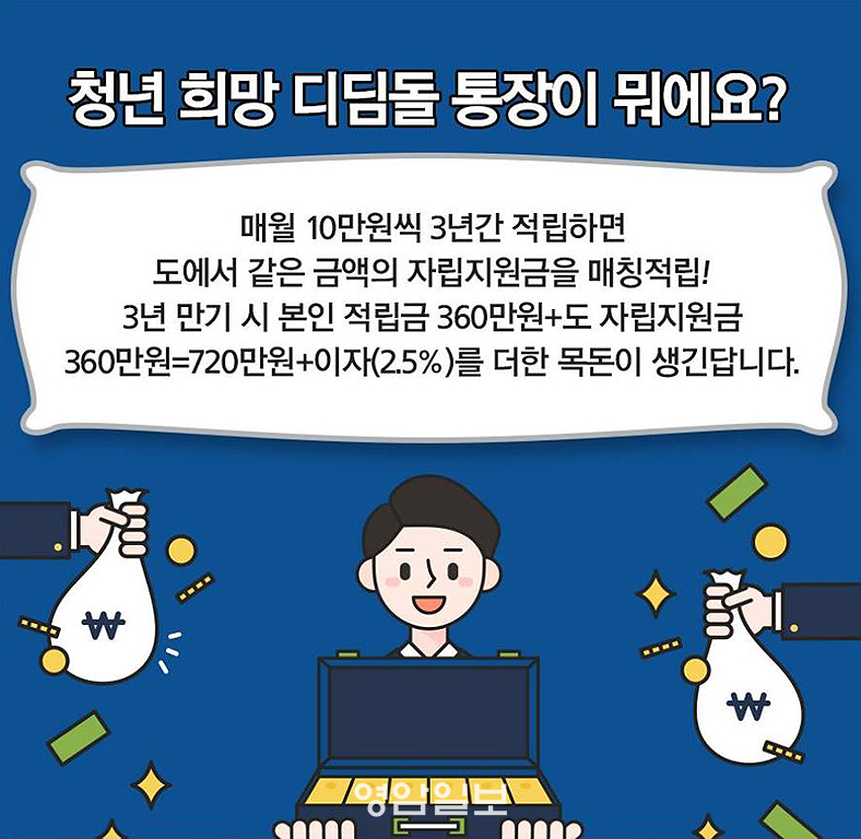 û³â Èñ¸Á µðµõµ¹ ÅëÀåÀº 3³â°£ ¸Å¿ù 10¸¸¿ø¾¿ 360¸¸¿øÀ» Àû¸³ÇÏ¸é º»ÀÎ Àû¸³±Ý°ú ¶È°°Àº ±Ý¾×À» Àü³²µµ¿Í ¿µ¾Ï±ºÀÌ Áö¿øÇØ ¸¸±â ½Ã ÃÑÀû¸³±Ý 720¸¸¿ø°ú ÀÌÀÚ ÇýÅÃÀ» ¹Þ´Â´Ù.