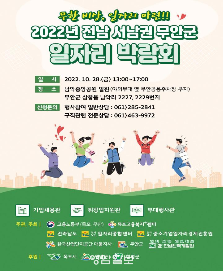 À̹ø ¹Ú¶÷ȸ´Â °í¿ë³ëµ¿ºÎ ¸ñÆ÷¡¤¹«¾È°í¿ëº¹ÁöÇ÷¯½º¼¾ÅÍ, Àü¶ó³²µµ, Àü¶ó³²µµ Áß¼Ò±â¾÷ÀÏÀÚ¸®°æÁ¦ÁøÈï¿ø, Àü¶ó³²µµ ÀÏÀÚ¸®Á¾ÇÕ¼¾ÅÍ, Çѱ¹»ê¾÷´ÜÁö°ø´Ü ´ëºÒÁö»ç°¡ °øµ¿ ÁÖ°üÇÏ°í ¹«¾È±ºÀÌ ÁÖÃÖÇÏ¸ç ¸ñÆ÷½Ã, ¿µ¾Ï±º, ÇÔÆò±ºÀÇ ÈÄ¿øÀ¸·Î ¼³²±Ç Àüü °í¿ë½ÃÀåÀ» ¾Æ¿ì¸¥´Ù.