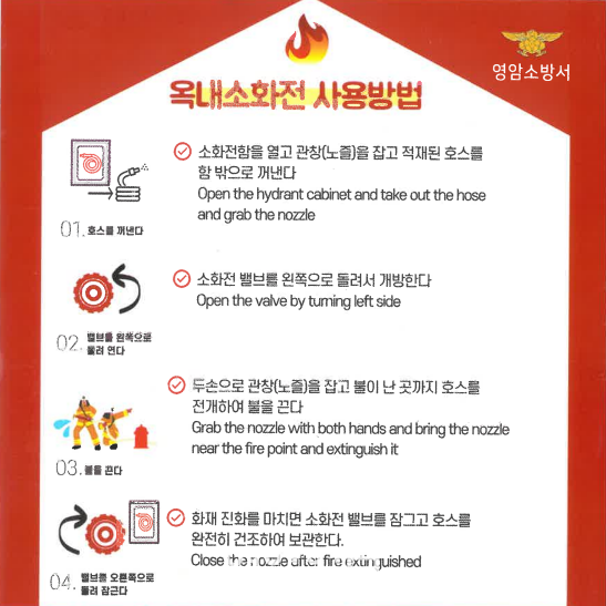 '22³â 12¿ù ½ÃÇàµÈ °³Á¤µÈ ¿Á³»¼ÒÈÀü¼³ºñÀÇ ÈÀç¾ÈÀü¼º´É±âÁØ(NFPC 102) Á¦7Á¶(ÇÔ ¹× ¹æ¼ö±¸ µî) 5Ç׿¡ µû¸£¸é ¡®¿Á³»¼ÒÈÀü¼³ºñÀÇ ÇÔ °¡±îÀÌ º¸±â ½¬¿î °÷¿¡ ±× »ç¿ë¿ä·ÉÀ» ±âÀçÇÑ Ç¥ÁöÆÇÀ» ºÙ¿©¾ß Çϸç, Ç¥ÁöÆÇÀ» ÇÔÀÇ ¹®¿¡ ºÙÀÌ´Â °æ¿ì¿¡´Â ¹®ÀÇ ³»ºÎ ¹× ¿ÜºÎ ¸ðµÎ¿¡ ºÙ¿©¾ß ÇÑ´Ù. ÀÌ °æ¿ì, »ç¿ë¿ä·ÉÀº ¿Ü±¹¾î¿Í ½Ã°¢ÀûÀÎ ±×¸²À» Æ÷ÇÔÇÏ¿© ÀÛ¼ºÇØ¾ß ÇÑ´Ù.¡¯°í ¸í½ÃµÇ¾î ÀÖ´Ù.
