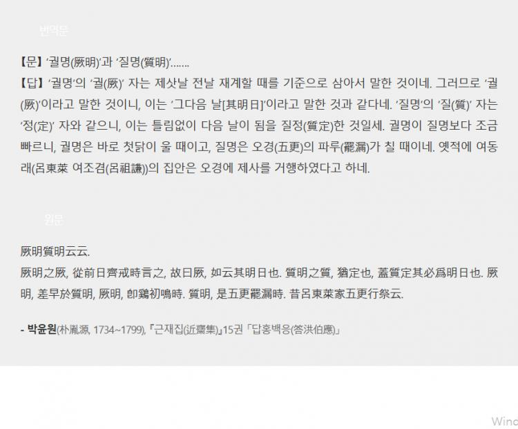 ¿¹ÇÐ(ÖÉùÊ)¿¡ Á¶¿¹°¡ ±í¾ú´ø ±ÙÀç´Â Á¦ÀÚÀÇ ¹°À½¿¡ ´ëÇÏ¿© ÂüÀ¸·Î °£¸í(ÊÛÙ¥)ÇÏ°Ô ¼³¸íÇØ ÁÖ¾ú´Ù. ¡®±È¸í¡¯À̶õ ¡®°èÃʸí(Í®ôøÙ°)¡¯, Áï ¡®°è¸í(ٰͮ)¡¯Àε¥, ÀÌ´Â ´ëü·Î Ãà½Ã(õäãÁ, ¿ÀÀü 1½Ã 30ºÐ~3½Ã 30ºÐ)¿¡ »ó´çÇÑ´Ù. ¡®Áú¸í¡¯À̶õ ¡®¿À°æ(çéÌÚ)ÀÇ ÆÄ·ç(÷óש)°¡ Ä¥ ¶§¡¯·Î, ¿À°æ »ïÁ¡(ß²ïÇ)Àε¥, ÀÌ´Â ´ëü·Î ÀνÃ(ìÙãÁ, ¿ÀÀü 3½Ã 30ºÐ~5½Ã 30ºÐ)¿¡ »ó´çÇÑ´Ù. ¿äÄÁ´ë, ±ÙÀçÀÇ ¸»ÀÎÁï½¼ ¹Ù·Î Á¦»ñ³¯ ´çÀÏ Ãà½Ã¿¡ ÀÏÂġ ÀϾ¼ Àνÿ¡ Á¦»ç¸¦ °ÅÇàÇÑ´Ù´Â °ÍÀÌ´Ù. ±× ½Ç·Ê(ãùÖÇ)·Î¼ ±ÙÀç´Â ¡®¿©µ¿·¡ÀÇ Áý¾È¡¯À» ¾ð±ÞÇÏ¿´´Âµ¥, ´Ù¸¥ ±â·ÏÀ» ã¾Æº¸¸é ¿À°æ¿¡ Á¦»ç¸¦ °ÅÇàÇÑ °ÍÀº ¡®Á¤ÀÚ(ïïí)ÀÇ Áý¾È[ïïíÊ«]¡¯, ¡®Á¤ÀÌõÀÇ Áý¾È[ïïì¥ô¹Ê«]¡¯À̶ó°í ÀüÇØÁö±âµµ ÇÑ´Ù.