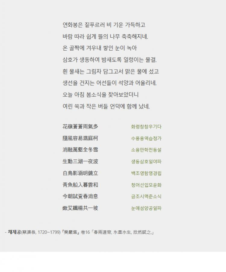 ÀÌ ½Ã´Â ¼º¾¾Á¤(à÷ä«ïÍ)¿¡ Áö³¾ ¶§ ÁöÀº µíÇÏ´Ù. º½ºñ°¡ ³»¸° µÚ ¸¶Æ÷ÀÇ Á¤°æÀ» ¹¦»çÇÏ¿´´Ù. ¿¬ÈºÀÀº ºñ ±â¿îÀ¸·Î £Ǫ¸£°í, »ïÈ£´Â °Ü¿ì³» ¾óÀ½ÀÌ ³ì¾Æ Ãâ··ÀδÙ. °Å¿ï °°Àº ¸¼Àº °¿¡ Èò ¹°»õ ±×´ë·Î ºñÄ¡°í Àú¹°³è µ¹¾Æ¿À´Â °í±ê¹è´Â ±¸¸§ ¼ÓÀ¸·Î µé¾î°¡´Â µíÇÏ´Ù. Ø¡°ú ûú´Â ùä°ú ìýÀ» ²Ù¸çÁÖ´Â ºÎ»ç·Î Ø¡Àº Áï½Ã[ءʾ]¶ó´Â ¶æÀ̰í ûú´Â õõÈ÷ ½º¸çµå´Â[ë×ýç] ÀǹÌÀÌ´Ù.