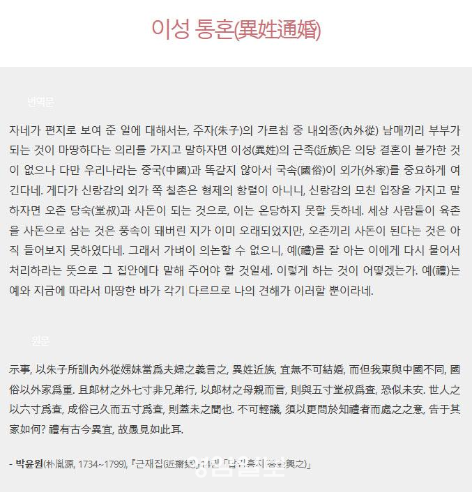 ±ÙÀç(ÐÎî±) ¹ÚÀ±¿ø(ÚÓëÊê¹)ÀÌ »ì¾Ò´ø 18¼¼±â¿¡µµ ¡®À̼º Ä£ÀÎ °£ÀÇ È¥ÀΡ¯Àº ¿©ÀüÈ÷ ³í¶õ°Å¸®¿´´Ù. À§¿¡¼ ÀοëÇÑ ÆíÁö´Â ±ÙÀç°¡ ¸ÅÁ¦ ±èÀç¼ø(ÑÑî¤âè, 1733~?)ÀÇ ¾çÀÚ ±è½Ã±Ù(ÑÑãÉÐÆ, 1755~1825)¿¡°Ô ´äÇÑ °ÍÀÌ´Ù. ÆíÁöÀÇ ³»¿ëÀ» »ìÆìº¸¸é, ¾î¶² À̰¡ ±è½Ã±Ù¿¡°Ô ¡®À̼º Ä¥ÃÌ °£ÀÇ È¥ÀΡ¯¿¡ ´ëÇÏ¿© Áú¹®ÇÏ¿´´Âµ¥, ±è½Ã±ÙÀÌ ´Ù½Ã ÀÌ Áú¹®À» °¡Áö°í ±ÙÀç¿¡°Ô ¹°¾îº¸ÀÚ, ±ÙÀç°¡ ´äÇØ ÁØ °ÍÀÌ´Ù.