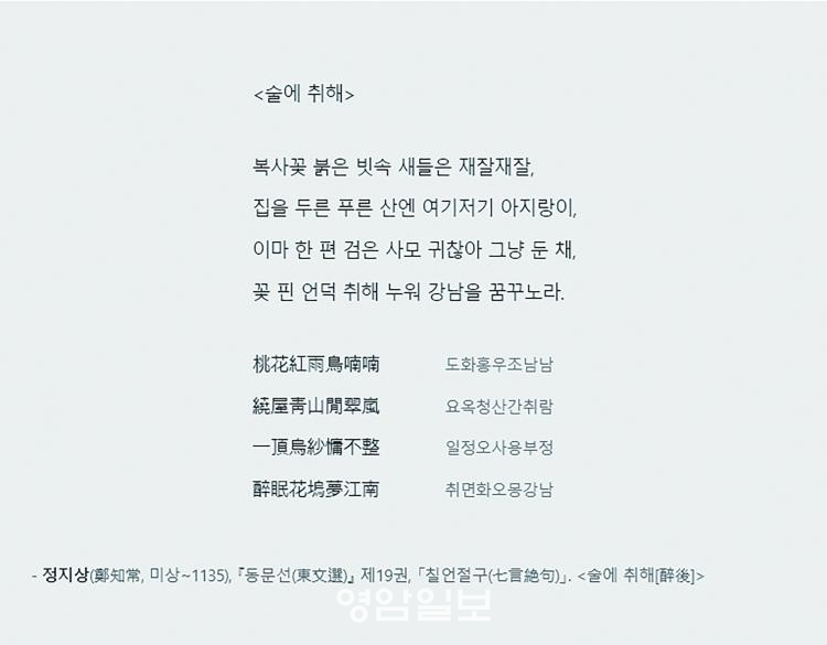 ÀÌ ½Ã´Â ³²È£(ÑõûÉ) Á¤Áö»óÀÇ ´ëÇ¥ÀÛ Áß ÇϳªÀÎ <¼ú¿¡ ÃëÇØ[öý]>¶ó´Â ½Ã·Î, ÀÌÀüºÎÅÍ ¿ì¸® ¼±Àε鿡 ÀÇÇØ ¼ö¾øÀÌ °Å·ÐµÇ¾ú´ø ÀÛǰÀÌ´Ù. ÀÌ ½Ã¿¡ ´ëÇØ ±èÁ¾Á÷Àº ¡ºÃ»±¸Ç³¾Æ¡»¿¡¼ ¡°°öµð°í¿î ¸ð½ÀÀÌ ³Ê¹« ½ÉÇÏ´Ù[æýÕò÷¼ä¤].¡±¶ó°í Çß°í, ÃÖÀÚ´Â ¡ºº¸ÇÑÁý¡»¿¡¼ ¡°ÀÌ ½Ã´Â ±×¸²À¸·Î ¿©°Ü º¼ ¸¸ÇÑ ½ÃÀÌ´Ù[ó®ãÌʦíÂÓñ畫Ê×å¥].¡±¶ó°í ÇßÀ¸¸ç, ½ÅÈìÀº ¡¸Ã»Ã¢¿¬´ã¡¹¿¡¼ ¡°³î¶øµµ·Ï »©¾î³ª°í ½Ã¾î°¡ ¾Æ¸§´Ù¿ö ¿ì¸®³ª¶óÀÇ ½Ã Áß¿¡¼ ºñ±³ÇÒ ¸¸ÇÑ ½Ã°¡ µå¹°´Ù[ÌíÚûðÝÕò, ä²ÔÔñýãÌ, àØêóÐìÝï.].¡±¶ó°í ÇßÀ» Á¤µµ·Î ÀÎÁ¤¹Þ¾Ò´ø ½ÃÀÌ´Ù.