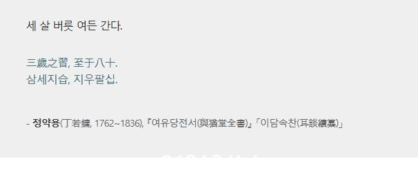 ´Ù»êÀÇ ¼Ó´ã ¹ø¿ª¹®À̶ó ÇÒ ¼ö ÀÖ´Â ¡®ß²á¨ñýã§, ò¸éÍø¢ä¨.¡¯Àº ÁßÇб³ Çѹ® ±³°ú¼¿¡µµ ¼ö·ÏµÇ¾î ÀÖÀ» ¸¸Å ³Î¸® ¾Ë·Á ÀÖ´Ù. ±×·±µ¥ ÀÌ ¹ø¿ª¹®ÀÇ ¿ø¹®ÀÎ ¡®¼¼ »ì ¹ö¸© ¿©µç °£´Ù.¡¯´Â »ç½Ç ´©°¡ ¾ðÁ¦ ¸¸µé¾ú´ÂÁö Á¤È®È÷ ¾Ë ¼ö ¾ø´Ù. ¹ö¸© ³ª»Û ¾î¶² ´ÄÀºÀÌÀÇ ÈäÀ» º¸¸ç ³ª¿Â ¸»ÀÎÁö, ¾Æ´Ï¸é Á¦ ½º½º·Î °í¾àÇÑ ½À°üÀ» Æò»ý ¸ø °íÄ£ ÇÑ ³ëÀÎÀÇ ÀÚÁ¶(í»ð¿) ¼¯ÀÎ ¹Ý¼ºÀ̾ú´ÂÁö ±×Àú »ó»ó¸¸ ÇÒ ¼ö ÀÖÀ» »ÓÀÌ´Ù. ź»ý ºñÈ¾ß ¾î¶»µç ÀÌ ¶¥¿¡¼ »ì´ø ¾î´À ´©±º°¡ÀÇ ¸»¿¡¼ ³ª¿Â ÀÌ ¸»ÀÌ ¿À·§µ¿¾È ¼ö¸¹Àº »ç¶÷µé ÀÔ¿¡ ¿À¸£³»·Á ´Ù»êÀÇ ±Í¿¡µµ ¸¹ÀÌ À;úÀ» °ÍÀÌ´Ù. ´Ù»êÀº ÀÌ ¼Ó´ã¿¡ ´ëÇØ ¡°¾î·ÈÀ» ¶§ ÇÏ´ø ÀÏÀÌ ³¡³» ³ª»Û ½À°üÀÌ µÇ¾î ´Ä¾î¼µµ °íÄ¡Áö ¸øÇÔÀ» ¸»ÇÑ °ÍÀÌ´Ù.¡±¶ó´Â Ä£ÀýÇÑ ¼³¸í±îÁö µ¡ºÙ¿© µÎ¾ú´Ù.