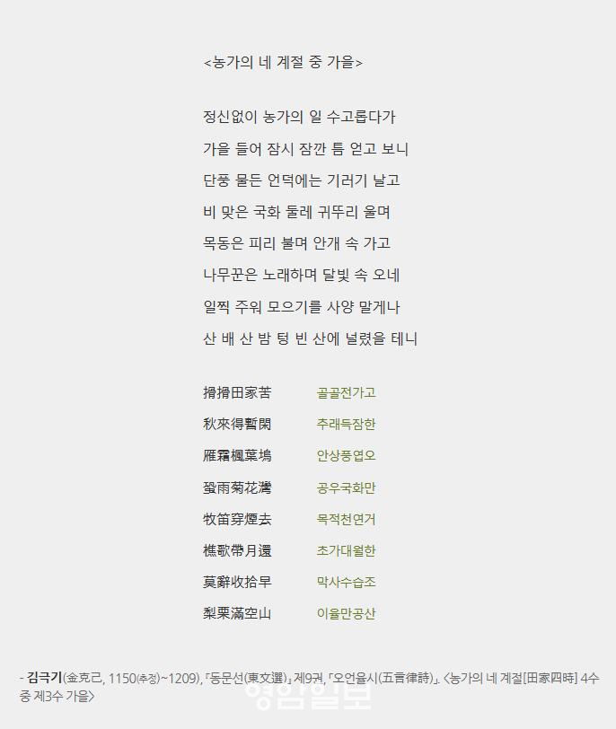 ÀÌ ½Ã´Â ´ç½Ã ³ó°¡ÀÇ ÀüÇüÀûÀÎ ¸ð½ÀÀ» Àß ±×·Á³½ ½Ã·Î Æò°¡¹Þ´Âµ¥, ÀÌ ½Ã¿¡¼´Â °¡À»ÀÇ Á¤Ã븦 ´ã°í ÀÖ´Â ÀÚ¿¬¹°°ú °¡À»À̶ó´Â °èÀý¿¡ º¼ ¼ö ÀÖ´Â ³ó°¡ÀÇ Ç³°æÀ» ±×¸®°í ÀÖ´Â ÇԷðú °æ·ÃÀÌ ÁÖ¸ñµÈ´Ù. ƯÈ÷ ÇԷÿ¡¼ ´ÜdzÀÇ ºÓÀººû°ú ±¹ÈÀÇ ³ë¶õºû, ÇÏ´ÃÀ» ³ª´Â ±â·¯±â¿Í ¶¥¿¡¼ ¿ï°í ÀÖ´Â ±Í¶Ñ¶ó¹Ì, ´Üdz°ú ±â·¯±â¸¦ ¸ðµÎ ²Ù¸çÁÖ´Â ¼¸®[ßÜ]¿Í ±¹È¿Í ±Í¶Ñ¶ó¹Ì¸¦ ¸ðµÎ ²Ù¸çÁÖ´Â ºñ[éë]ÀÇ ´ëºñ´Â ÀÌ ½Ã°¡ ½ÃÀûÀÎ ±â±³¿¡¼µµ ¶Ù¾î³ ¼öÁØ¿¡ À̸£·¶À½À» º¸¿©ÁØ´Ù.