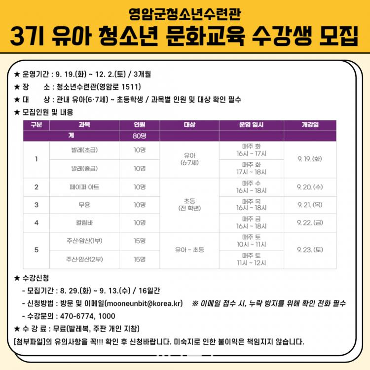 ¹®È±³À°ÀÇ ¼ö°·á¿Í Àç·áºñ´Â ¹«·á´Ù. ´Ü, ¹ß·¹º¹°ú ÁÖÆÇÀº °³ÀÎÀÌ ¸¶·ÃÇØ¾ß ÇÑ´Ù. ¼ö°½Åû¼´Â ¿µ¾Ï±ºÃ»¼Ò³â¼ö·Ã°ü¿¡ ¹æ¹®Çϰųª À̸ÞÀÏ(mooneunbit@korea.kr)·Î Á¢¼öÇÒ ¼ö ÀÖ´Ù. ¹®È±³À°ÀÇ ¼¼ºÎ ³»¿ëÀº ¿µ¾Ï±ºÃ»¼Ò³â¼ö·Ã°ü ȨÆäÀÌÁö¿¡ °Ô½ÃµÅÀÖ´Ù. ÀÚ¼¼ÇÑ ¾È³»´Â 061-470-1000¿¡¼ ÇÑ´Ù.