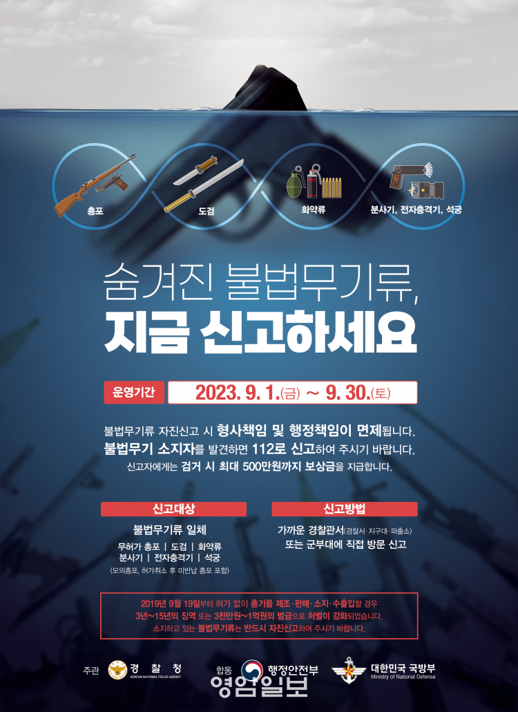 ºÒ¹ý¹«±â·ù¸¦ ¼ÒÁöÇϰí Àְųª ºÒ¹ý¹«±â ¹Ð°Å·¡ Á¶Á÷, ºÒ¹ý¹«±â ¼ÒÁöÀÚ ½Å°í ½Ã¿¡´Â ÃÖ´ë 500¸¸¿øÀÇ °Ë°Åº¸»ó±ÝÀ» Áö±ÞÇÒ ¹æÄ§ÀÌ´Ù. ¶ÇÇÑ ¿µ¾Ï°æÂû¼ °ü°èÀÚ´Â ¡°ÀÚÁø½Å°í ±â°£ Á¾·á ÈÄ 10¿ù ÇÑ ´Þ µ¿¾È Àü±¹ÀûÀ¸·Î ºÒ¹ý¹«±â·ù ÁýÁߴܼÓÀÌ ½Ç½Ã µÉ ¿¹Á¤À¸·Î ¼ÒÁöÇϰí ÀÖ´Â ºÒ¹ý¹«±â·ù´Â ¹Ýµå½Ã ÀÚÁø½Å°í ¹× ÁÖº¯¿¡¼ ºÒ¹ý¹«±â·ù¸¦ ¼ÒÁöÇÑ »ç¶÷ ¹ß°ßÇÒ °æ¿ì 112³ª °æÂû°ü¼¿¡ ½Å°í ´çºÎµå¸°´Ù¡± °í Çß´Ù.