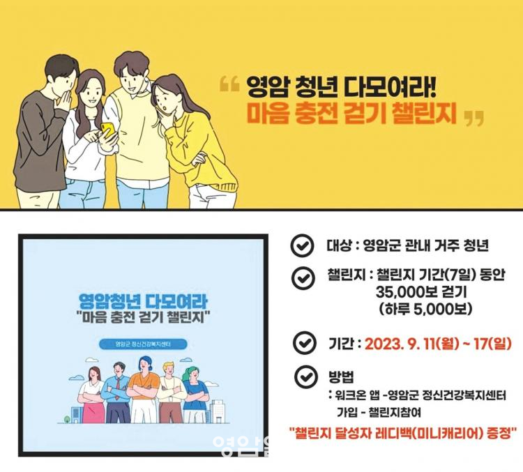 ÇØ´ç ±â°£ µ¿¾È 3¸¸5000º¸ ÀÌ»óÀ» °É¾î ¸ñÇ¥¸¦ ´Þ¼ºÇϴ û³â¿¡°Ô´Â ¼ÒÁ¤ÀÇ »óǰÀ» Áö±ÞÇÑ´Ù. À̹ø 縰Áö¿¡´Â ¿µ¾Ï±º û³â ´©±¸³ª Âü¿©ÇÒ ¼ö ÀÖÀ¸¸ç, ÈÞ´ëÆù¿¡ ¸ð¹ÙÀÏ °È±â ¾Û ¡®¿öÅ©¿Â¡¯À» ¼³Ä¡Çϰí, ¿µ¾Ï±ºÁ¤½Å°Ç°º¹Áö¼¾ÅÍ Ä¿¹Â´ÏƼ¿¡ °¡ÀÔÇØ ¡®Ã§¸°Áö¡¯ ÅÇ ¡®¿µ¾Ï±º û³â ´Ù ¸ð¿©¶ó ¸¶À½ÃæÀü °È±â ÿ¸°Áö¡¯¿¡ µé¾î°¡ Âü¿©Çϱ⸦ ´©¸£¸é ½ÃÀ۵ȴÙ.