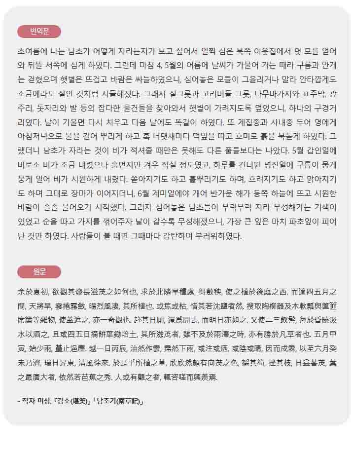 ±¹¸³Áß¾Óµµ¼°ü¿¡ ¡º°¨¼Ò(ÊíáÅ)¡»¶ó´Â Çʻ纻(ù¶ÞÐÜâ) ÀÚ·á°¡ ¼ÒÀåµÇ¾î ÀÖ´Ù(ÇÑͯðÈ93-154). ¡®¿ôÀ» ¸¸ÇÑ À̾߱⡯¶ó´Â ¶æÀÇ Á¦¸ñÀ» °¡Áø ÀÌ ÀÚ·á´Â ÁöÀºÀ̸¦ ¾Ë ¼ö ¾ø°í ºÐ·®Àº 9Àå¿¡ ºÒ°úÇѵ¥, ±×Áß ¡¸³²Ãʱâ(Ñõõ®ÑÀ)¡¹¶ó´Â ±ÛÀÌ ¼ö·ÏµÇ¾î ÀÖ´Ù. Á¦¸ñ ±×´ë·Î ´ã¹è¿¡ ´ëÇÑ ±â¹®(ÑÀÙþ)Àε¥, ´õ ±¸Ã¼ÀûÀ¸·Î ¸»ÇÏÀÚ¸é ´ã¹è Àç¹è °æÇèÀ» ±â·ÏÇÑ ±ÛÀÌ´Ù. ÁöÀºÀÌ¿Í Àú¼ú ½Ã±â¸¦ ¾Ë ¼ö ¾ø±â´Â ÇÏÁö¸¸ »ç´ëºÎ ½ÄÀÚÃþÀÌ Á÷Á¢ ±â·ÏÇÑ ´ã¹è Àç¹è °æÇè´ãÀ̶ó´Â Á¡¿¡¼ Èñ±ÍÇÑ ÀÚ·á¶ó°í ÇÒ ¼ö ÀÖ´Ù. ÁöÀºÀÌ´Â ÀÌ ÀÛǰ¿¡¼ ´ã¹è°¡ Å©°Ô À¯ÇàÇÏ´ø ´ç½ÃÀÇ ½Ã´ë »óȲÀ» ¸»ÇÏ´Â °ÍÀ¸·Î½á ±ÛÀÇ ¼µÎ¸¦ ¿¬ µÚ, ÀÚ½ÅÀÌ ´ã¹è¸¦ Àç¹èÇÑ °úÁ¤À» Àû°í ÀÖ´Ù.