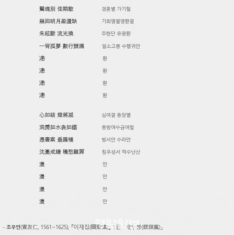 Àü´Ü(îñÓ«)ÀÇ °æ¿ì À̺° ÈÄ ½Ã°£ÀÌ ¾î´À Á¤µµ Áö³ ½ÃÁ¡, °¡À»³¯ ¹ã ¹®µæ ³¯¾Æµç ±â·¯±â¿¡ ¿¾ ±â¾ïÀÌ ¶°¿À¸£¸ç ¾µ¾µÇÔÀ» ´À³¢´Â »óȲÀ¸·Î º¸ ¡®¾Æ·ÃÇÏ´Ù¡¯¶ó°í ¹ø¿ªÇÏ¿´´Ù. ÈÄ´Ü(ýÓ«)¿¡¼´Â À̺°ÀÇ ¾ÆÇÄÀ¸·Î ¹ã»õ ÀáµéÁö ¸øÇÑ Ã¤ ½Ã¸§°Ü¿öÇÏ´Â »óȲÀ¸·Î º¸¾Æ¡®Ø¼¡¯À» ¡®½É¶õÇÏ´Ù¡¯¶ó°í ¹ø¿ªÇÏ¿´´Ù. ´õ ÀûÀýÇÑ ¹ø¿ª¾î°¡ ÀÖ´Ù¸é °¡¸£Ä§À» ÁÖ½Ã±æ °í´ëÇØ º»´Ù. Á¶¿ìÀÎÀÌ ¾î¶°ÇÑ »óȲ¿¡¼ ÀÌ ÀÛǰÀ» Áö¾ú´ÂÁö ¾Ë ¼ö ¾ø´Ù. ½ÇÁ¦ ´©±º°¡¿Í À̺°ÇÑ ÈÄ ±×¸®¿ò°ú ¾ÆÇÄÀ» ´ã¾Æ Áö¾úÀ» ¼öµµ ÀÖ°í, ´Ü¼øÈ÷ °í½Ã°¡ÀÇ ±¸ÀýÀ» Â÷¿ëÇÏ¿© ½ÃÇèÀûÀ¸·Î Áö¾úÀ» ¼öµµ ÀÖ´Ù. ¾îÂî µÇ¾úµç Á¶¼± ½Ã´ë ÀÌ ÀÛǰ ¿Ü¿¡ ´Ù¸¥ äµÎºÀÀÌ ¹ß°ßµÇÁö ¾Ê´Â´Ù´Â Á¡, ¸¶Áö¸· ¿îÀ» ³× ¹ø ¹Ýº¹ÇÏ¸ç ±âÁ¸ äµÎºÀÀÇ °Ý·ü¿¡¼ ¹þ¾î³ ÆÄ°ÝÀ» ¼±º¸ÀÎ Á¡À¸·Îµµ ÃæºÐÈ÷ ÁÖ¸ñÇÒ ¸¸ÇÑ ÀÛǰÀ̶ó »ý°¢µÈ´Ù. ƯÈ÷ ¸¶Áö¸· ¹Ýº¹ÇÑ ³× ±ÛÀÚ¿¡´Â ±Û·Î´Â ´Ù Ç¥ÇöÇÏÁö ¸øÇÑ ½ÃÀÎÀÇ ¸¶À½ÀÌ ´ã°Ü ÀÖ´Â °Í¸¸ °°´Ù. À̺°¿¡ ¾ÆÆÄÇØ º» Àû ÀÖ´Â »ç¶÷À̶ó¸é ±× Àý½ÇÇÑ ½ÉÁ¤À» Ȥ ´À²¸º¼ ¼ö ÀÖÀ» °ÍÀÌ´Ù.