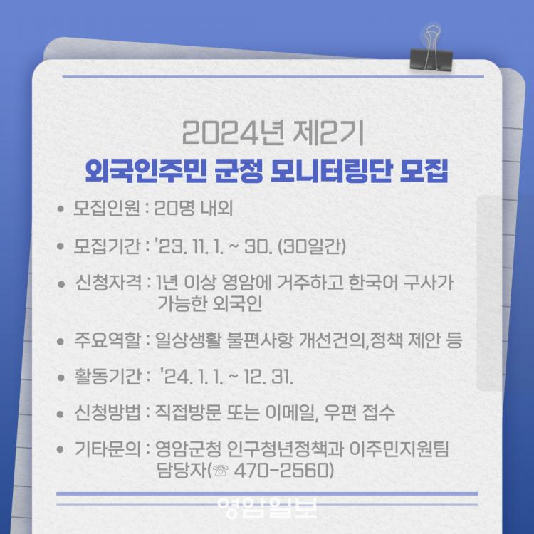 ¸ð´ÏÅ͸µ´Ü Âü¿©¸¦ Èñ¸ÁÇÏ´Â ¿Ü±¹ÀÎÁÖ¹ÎÀº, ¿µ¾Ï±ºÈ¨ÆäÀÌÁö ¡®°í½Ã°ø°í¡¯³À» Âü°íÇØ ½Åû¼¸¦ ÀÛ¼ºÇØ Á¦ÃâÇÏ¸é µÈ´Ù. ½Åû¼´Â 11¿ù ¸»ÀϱîÁö ¿µ¾Ï±º Àα¸Ã»³âÁ¤Ã¥°ú ÀÌÁÖ¹ÎÁö¿øÆÀÀ¸·Î ¹æ¹®Çϰųª À̸ÞÀÏ(joyh1220@korea.kr) ¶Ç´Â ¿ìÆíÀ¸·Î Á¢¼öÇÏ¸é µÈ´Ù. ¸ð´ÏÅ͸µ´Ü¿¡ ´ëÇÑ ÀÚ¼¼ÇÑ ¾È³»´Â 061-470-2560¿¡¼ ÇÑ´Ù.