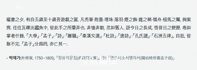 »óÀÚ¿¡ µç À⵿»ç´Ï ¼Ó¿¡´Â ¹ÚÁ¦°¡°¡ ¼Õ¼ö º£²¸ ÀûÀº ÇÑ ¹«´õ±âÀÇ Ã¥µéµµ ÀÖ¾ú´Ù. ¿©·¯ ±ÇÀÇ Ã¥µé °¡¿îµ¥¿¡¼µµ ƯÈ÷ ³× ±Ç Áß ÇѱÇÀÌ ¾ø¾îÁö°í ¼¼ ±ÇÀÌ ³²Àº ¡º¸ÍÀÚ¡» Ã¥Àº ±×¿¡°Ô ¾î¸° ½ÃÀýÀÇ Ãß¾ïÀ» ºÒ·¯ÀÏÀ¸Ä×´Ù. ¹ÚÁ¦°¡´Â ¾î¸± ÀûºÎÅÍ ±Û¾¾ ¾²±â¸¦ ÁÁ¾ÆÇÏ¿© º×À» ¹°°í ´Ù´Ï¸ç ¿©±âÀú±â ´ÚÄ¡´Â ´ë·Î ±Û¾¾¸¦ ½á´ò´Ù°í ÇÑ´Ù. 7»ì ¶§ ÁýÀÇ º®¿¡ ÀÌ¹Ì ÇϾé°Ô ³²¾ÆÀÖ´Â °÷ÀÌ ¾øÀ» Á¤µµ¿´±â¿¡ ±×ÀÇ ºÎÄ£ ¹ÚÆò(ÚÓøÀ)Àº ¸Å´Þ Á¾À̸¦ ³»·ÁÁÖ¾ú´Âµ¥, ±×´Â ÀÚ±âÀÇ ¼Õ°¡¶ô µÎ ¸¶µð¸¸ ÇÏ°Ô Á¾À̸¦ ¿À·Á Ã¥À» ¸¸µé°í Ã¥À» º£²¸ Àû¾ú´Ù°í ÇÑ´Ù. ÀÌ·¸°Ô ¸¸µå´Â Ã¥µéÀº ±×°¡ ÀÚ¶÷¿¡ µû¶ó Á¡Á¡ Ä¿Á³°í, ÀÌ¿ôÀÇ ¹þµéÀÌ ºô·Á °¡°í ¸ô·¡ °®°í °¡´Â Åë¿¡ ±ºµ¥±ºµ¥ À̰¡ ºüÁ®¹ö·È´Ù. ±×ÀÇ ¡º¸ÍÀÚ¡» Ã¥Àº ±×°¡ ¾ÆÈ© »ì ¶§ ¿«Àº °ÍÀ̾ú°í, ÀÌ ½Ã±â¿¡ ±×°¡ º£²¸¼ ¿«Àº Ã¥µéÀº ÀÌ¹Ì Ã¥ »óÀÚ¸¦ °¡µæ ä¿ì°í ÀÖ¾ú´Ù.
