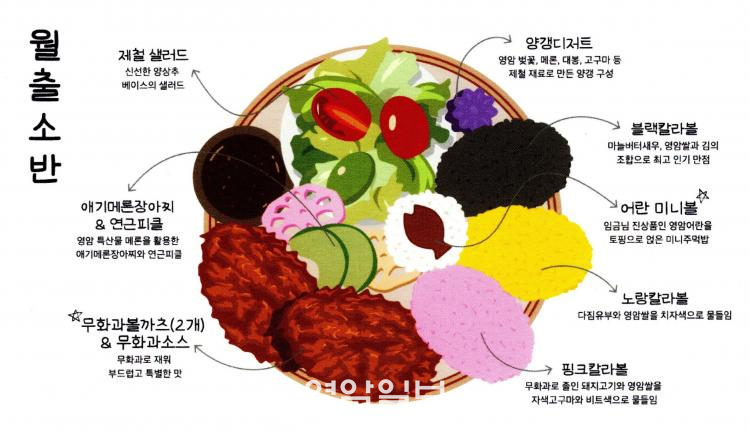 ¿ùÃâ¼Ò¹ÝÀº Áö¿ª Ư»ê¹°ÀÎ ÀÓ±Ý´Ô Áø»óǰÀÎ ¿µ¾Ï¾î¶õ°ú ¹«È°ú, ¾Ö±â¸á·ÐÀ¸·Î ±¸¼ºµÈ ¹ä»óÀÌ´Ù.