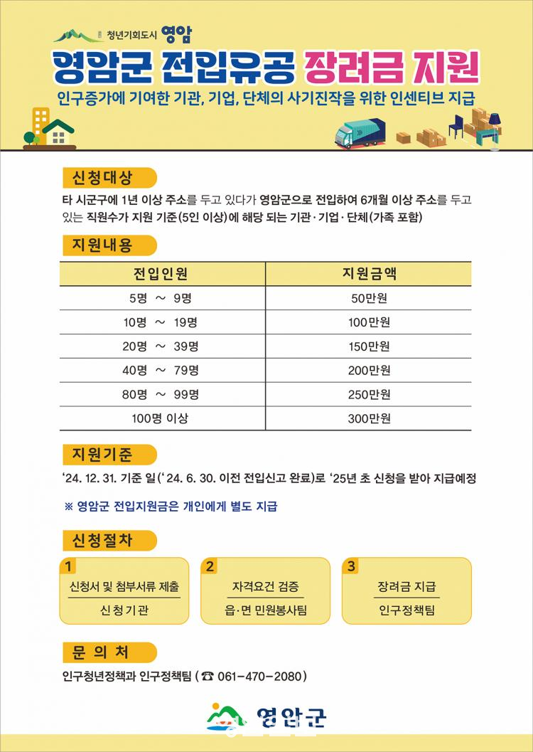 Àα¸ ÀüÀÔ À¯°ø Àå·Á±Ý Áö¿ø»ç¾÷¿¡ ´ëÇÑ ÀÚ¼¼ÇÑ ¾È³»´Â ¿µ¾Ï±º Àα¸Á¤Ã¥ÆÀ(061-470-2080)¿¡¼ ¾È³»ÇÑ´Ù.