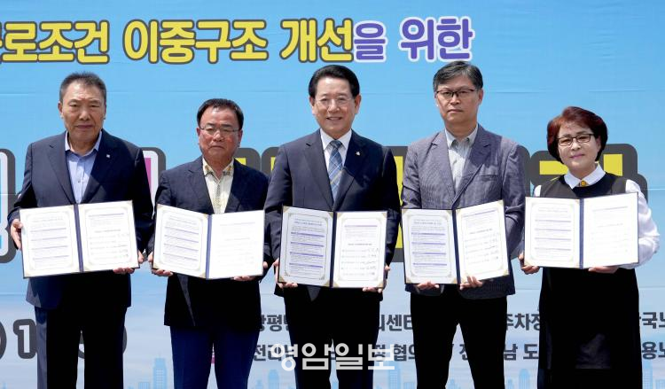 Àü³²µµ¿Í ±¤ÁÖÁö¹æ°í¿ë³ëµ¿Ã»Àº ³ëµ¿½ÃÀå ÀÌÁß±¸Á¶ °³¼±À» Áö¿øÇØ ÆòµîÇÑ ±âȸ ¼Ó¿¡¼ Àü³² ÁÖµµÇü ÀÏÀÚ¸® âÃâ, »ó»ý¹ßÀü Áö¿øÃ¼°è ±¸Ãà, »ê¾÷ÀçÇØ ¿¹¹æ µîÀ¸·Î ÇູÇÏ°í ¾ÈÀüÇÑ ÀÏÅ͸¦ Á¶¼ºÇÒ °ÍÀ» ¼±¾ðÇß´Ù.