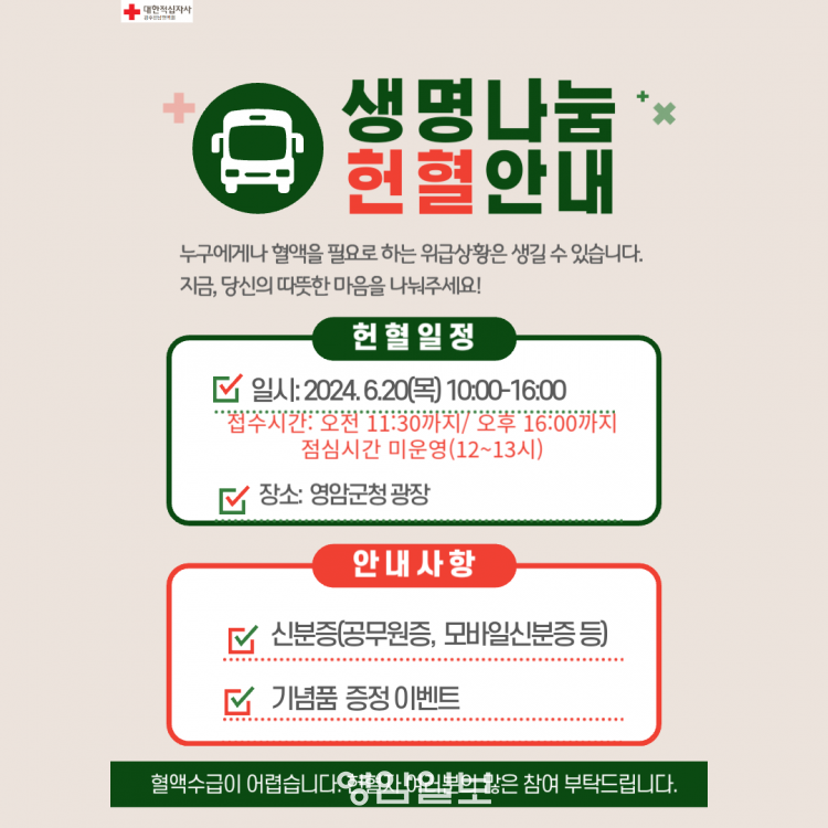 À̹ø ÇåÇ÷Àº ÀúÃâ»ê¡¤°í·ÉÈ·Î ÇåÇ÷ÀÚ°¡ Áö¼Ó °¨¼ÒÇϰí ÀÖ´Â »óȲ¿¡¼ Ç÷¾×ÀÇ ¾ÈÁ¤Àû °ø±ÞÀ» À§ÇØ ´ëÇÑÀû½ÊÀÚ»ç ±¤ÁÖ¡¤Àü³² Ç÷¾×¿ø°ú ÇÔ²² ÁøÇàÇÑ´Ù.