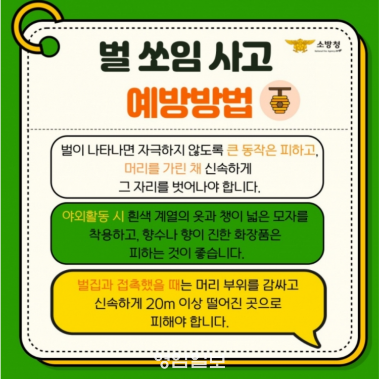 ¹ú ½îÀÓ »ç°í´Â ¹úÀÇ È°µ¿ÀÌ ¿Õ¼ºÇÑ 7~8¿ù¿¡ ¸¹ÀÌ ¹ß»ýÇÏ¿© ½Ç¿Ü ÀÛ¾÷À̳ª, µî»ê, ¹úÃʽà ÁÖÀǸ¦ ¿äÇÑ´Ù. ¹ú ½îÀÓ »ç°í ¿¹¹æÇÏ·Á¸é