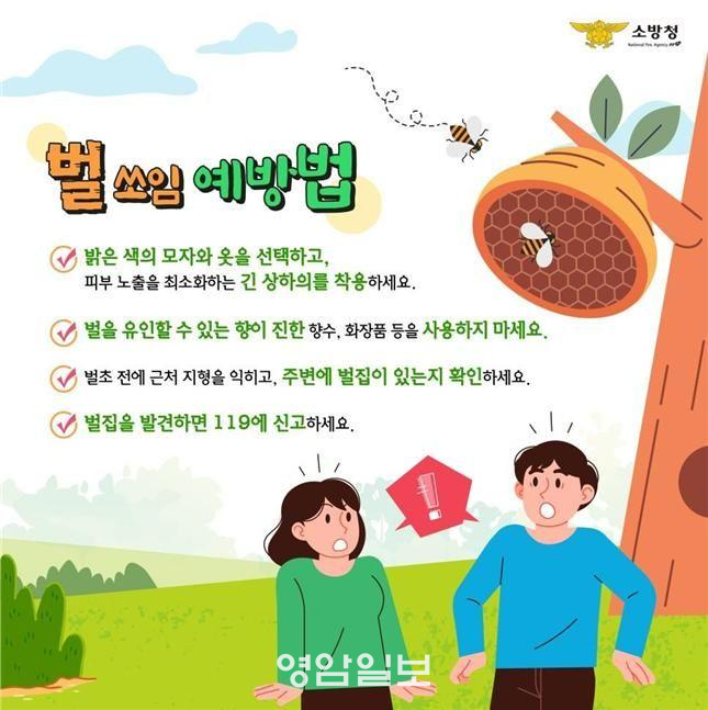 ¹ú ½îÀÓ »ç°í ¿¹¹æÀ» À§ÇØ ¹úÁý ¹ß°ß ½Ã Á¢±Ù ±ÝÁö ¹× 119 ½Å°í, ¹úÀ» ÀÚ±ØÇÏ´Â Çâ¼ö¿Í ÈÀåǰ, ½ºÇÁ·¹ÀÌ Á¾·ùÀÇ »ç¿ë ÀÚÁ¦, ¹àÀº °è¿ÀÇ ¿Ê Âø¿ë, ¹úÁýÀ» °Çµå¸± °æ¿ì ÀÚ¼¼¸¦ ³·Ãß°í ¸Ó¸®¸¦ °¡·Á 20m ÀÌ»ó ¹þ¾î³ª±â µîÀ» ´çºÎÇϰí ÀÖ´Ù.