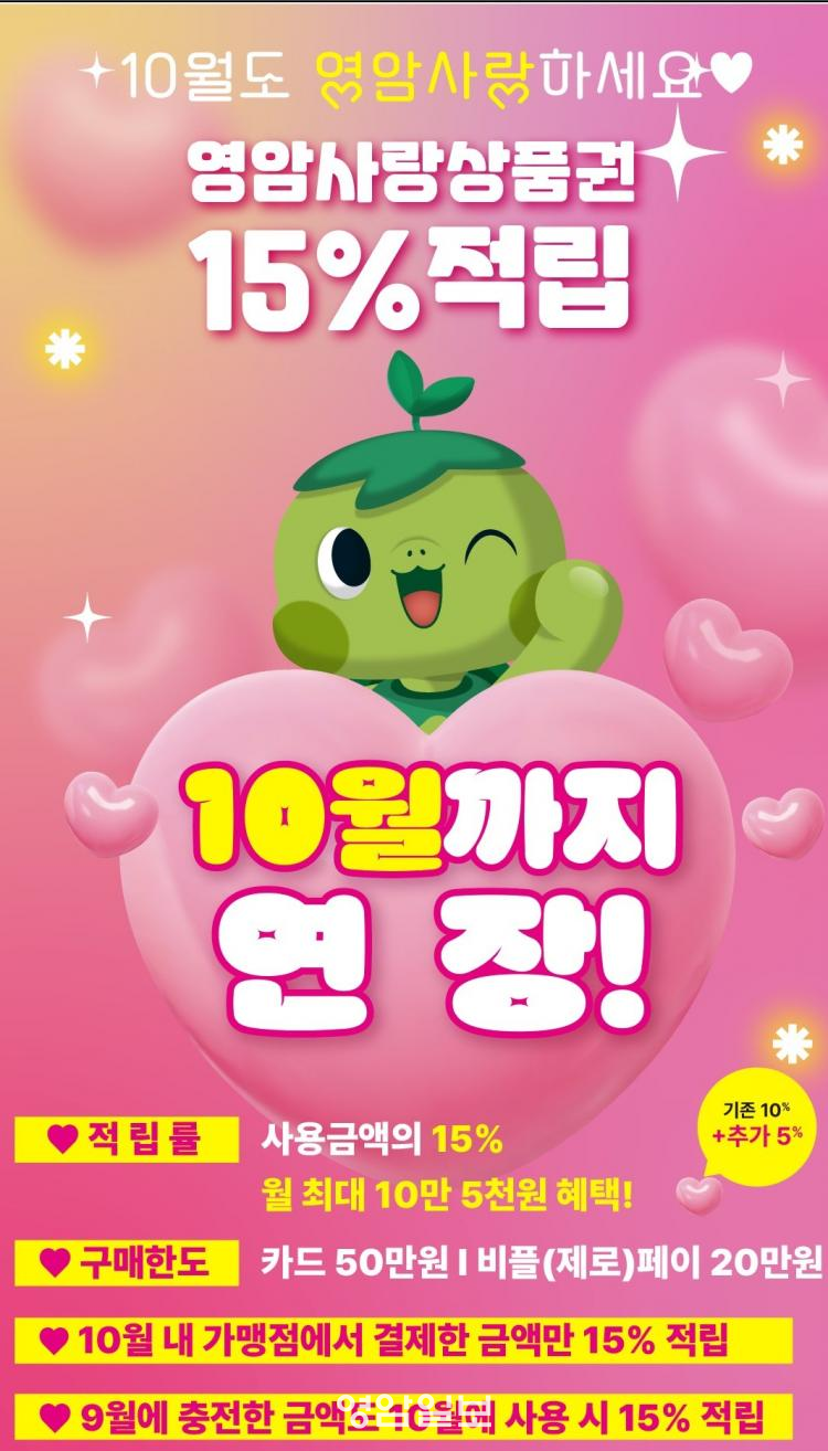 9¿ù°ú ¸¶Âù°¡Áö·Î À̹ø À̺¥Æ®ÀÇ ±¸¸ÅÇѵµ´Â 1ÀÎ ¿ù 70¸¸¿ø(Ä«µå 50, ¸ð¹ÙÀÏ 20)À̰í, 10¿ù ³»¿¡ ¿µ¾Ï»ç¶û»óǰ±Ç °¡¸ÍÁ¡¿¡¼ °áÁ¦Çϸé 15% Àû¸³ ÇýÅÃÀ» ¹ÞÀ» ¼ö ÀÖ´Ù.
