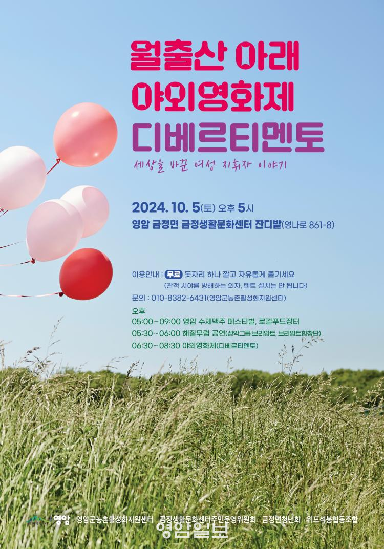 ¿À´Â 10¿ù 5ÀÏ(Åä) ¿ÀÈÄ 5½ÃºÎÅÍ ¡®¿ùÃâ»ê ¾Æ·¡ ¾ß¿Ü¿µÈÁ¦¡¯°¡ ±ÝÁ¤»ýȰ¹®È¼¾ÅÍ Àܵð¹ç(¿µ³ª·Î 861-8)¿¡¼ ¿¸°´Ù. ¿µ¾Ï±º³óÃÌȰ¼ºÈÁö¿ø¼¾ÅÍ, ±ÝÁ¤¸éû³âȸ(ȸÀå ÃÖÀçºÀ), À§µå¼®ºÀÇùµ¿Á¶ÇÕ(ÀÌ»çÀå ÀÌÈÆ)ÀÌ ÇÔ²² ÁغñÇÏ´Â Çà»ç·Î ¿µÈÁ¦¿Í ÇÔ²² ÇØÁú¹«·Æ °ø¿¬(¼º¾Ç±×·ì ºê¸®¾ÓÆ®, ºê¸®¾ÓÆ®ÇÕâ´Ü), ¿µ¾Ï¼öÁ¦¸ÆÁÖÇà»ç(1¸¸¿ø ¹«Á¦ÇÑ), ·ÎÄÃǪµå¡¤¼ö°ø¿¹ÀåÅÍ µîÀÌ ÆîÃÄÁø´Ù. ´©±¸³ª µ¾ÀÚ¸®¸¦ °¡Á®¿Í ¿µÈ¸¦ Áñ±æ ¼ö ÀÖ´Ù.