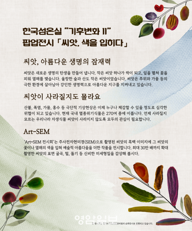 À̹ø ÆË¾÷ Àü½Ã´Â ÁÖ»çÀüÀÚÇö¹Ì°æ(SEM)À» ÀÌ¿ëÇÑ Art-SEM »çÁø Àü½Ãȸ·Î, ¾¾¾ÑÀ» ÃÖ´ë 30¸¸ ¹è±îÁö È®´ë ÃÔ¿µÇÑ À̹ÌÁö¸¦ ¹ÙÅÁÀ¸·Î, ¾¾¾ÑÀÌ ÀÚ¶ó¸é¼ ÇÇ¿ì´Â ²ÉÀ̳ª ¿¸ÅÀÇ »öÀ» ´õÇÏ¿© ¿¹¼úÀûÀÎ ÀÛǰÀ¸·Î Àçź»ý½ÃŲ ÀÛǰµéÀÌ Àü½ÃµÈ´Ù.