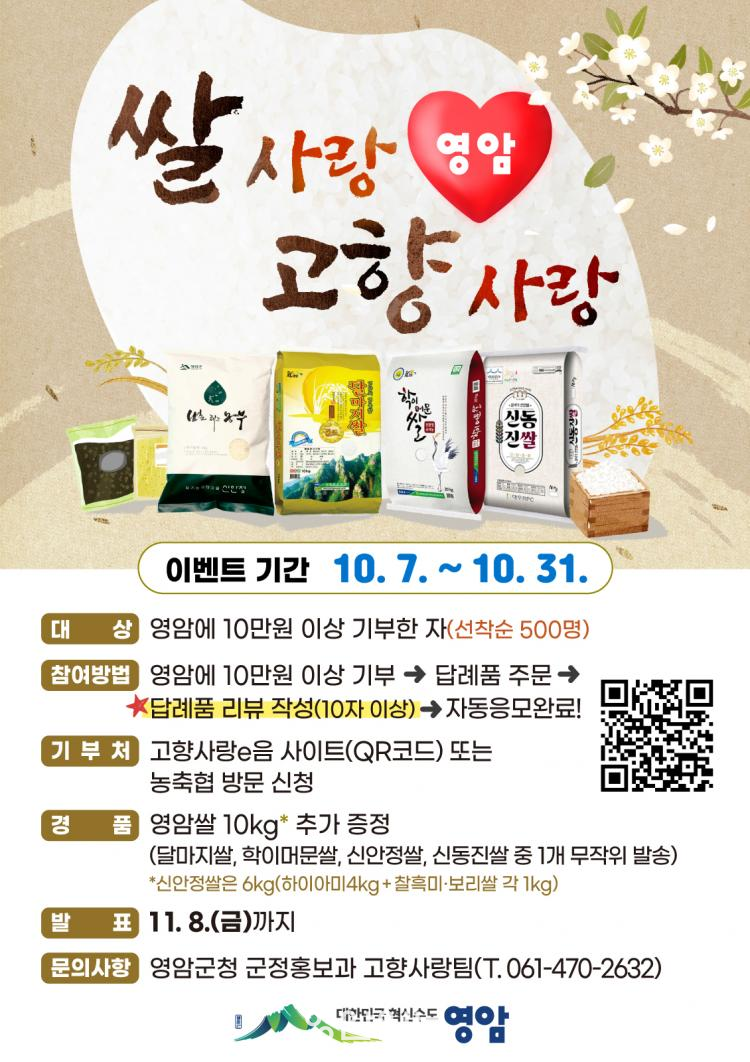 ¿µ¾Ï ½Ò ÆÇ¸Å¿Í °íÇâ»ç¶û±âºÎ ÃËÁøÀ» º´ÇàÇÏ´Â ÀÌ À̺¥Æ®´Â, ´ä·Êǰ¿¡ 3¸¸¿ø »ó´çÀÇ ¿µ¾Ï ½ÒÀ» Ãß°¡·Î Á¦°øÇÏ´Â ³»¿ë.