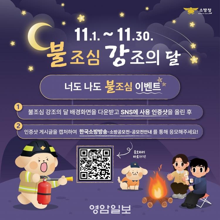 À̺¥Æ®´Â À̹ø ´Þ 11¿ù 1ÀϺÎÅÍ 11¿ù 30ÀϱîÁö ÇÑ ´Þ°£ ÁøÇàµÇ¸ç, Àü±¹¹Î ´©±¸³ª Âü¿©ÇÒ ¼ö ÀÖ´Ù. Âü¿© ¹æ¹ýÀº °£´ÜÇÏ´Ù. ÀÏ»ó ¼Ó¿¡ ÈÀç ¿¹¹æ ½À°üÀ» ½ÇõÇÏ´Â ¸ð½ÀÀ̳ª ¼Ò¹æÃ»ÀÌ Á¦°øÇÏ´Â µðÁöÅÐ ±ÂÁî »ç¿ë Èı⸦ ÀÎÁõ¼¦À¸·Î ÃÔ¿µÇÏ¿© °³ÀÎ SNS¿¡ ¿Ã¸° ÈÄ, ÇØ´ç °Ô½Ã¹°À» Ä¸Ã³ÇØ Çѱ¹¼Ò¹æ¹æ¼Û °ø¸ðÀü »çÀÌÆ®¿¡ ÀÀ¸ðÇÏ¸é µÈ´Ù. ´Ü, »çÁø¸¸ ÃÔ¿µÇϰí SNS¿¡ ¿Ã¸®Áö ¾ÊÀ¸¸é ¹«È¿ ó¸®µÇ´Ï À¯ÀÇÇØ¾ß ÇÑ´Ù.
