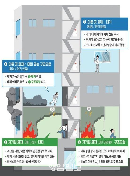 ¡®ºÒ³ª¸é »ìÆì¼ ´ëÇÇ¡¯´Â ÈÀç ¹ß»ý ½Ã ¹«Á¶°Ç ´ëÇÇÇÏ´Â °ÍÀÌ ¾Æ´Ï¶ó, È¿°°ú ¿¬±âÀÇ È®»ê °æ·Î µî ÁÖº¯ »óȲÀ» ¸ÕÀú »ìÆìº¸°í »óȲ¿¡ ¸ÂÃç ´ëÇÇÇØ¾ß ÇÑ´Ù´Â ³»¿ëÀ» ÇÙ½ÉÀ¸·Î ÇÑ´Ù. ƯÈ÷ ¾ÆÆÄÆ®¿Í °°Àº °øµ¿ÁÖÅÃÀº ¼¼´ë ¹ÐÁýµµ°¡ ³ô¾Æ ÈÀç ½Ã ¿¬±â°¡ °è´Ü, º¹µµ, ½Â°·Î µîÀ¸·Î ºü¸£°Ô È®»êµÉ À§ÇèÀÌ Ä¿, ¹«¸®ÇÑ ´ëÇǺ¸´Ù´Â »óȲ¿¡ ¸Â´Â ´ëÀÀÀÌ ÇÊ¿äÇÏ´Ù.
