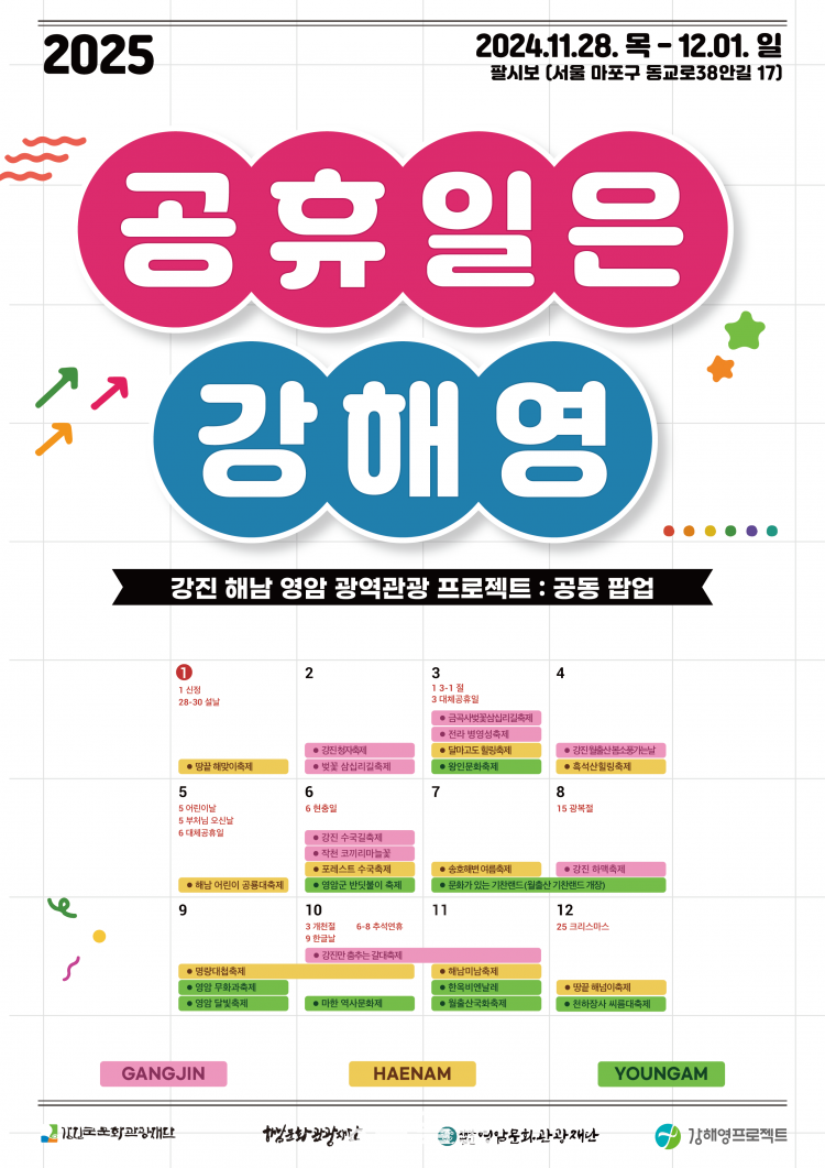 À̹ø ÆË¾÷ÀÇ ÇÙ½ÉÀº ¡®2025³â °ÇØ¿µ ´Þ·Â¡¯. 1~12¿ù·Î ±¸¼ºµÈ ÀÌ ´Þ·Â¿¡´Â µµ½Ã¹ÎÀÌ °øÈÞÀÏ¿¡ °ü±¤ÇÒ ¼ö ÀÖ´Â °Áø¡¤Çس²¡¤¿µ¾ÏÀÇ Ã¼Çè Çà»çµé·Î »©°îÇÏ´Ù. À̺¥Æ® Âü¿©ÀÚµéÀº °ÇØ¿µ ´Þ·ÂÀ» º¸°í, ÀڽŸ¸ÀÇ ¼¼ Áö¿ª ¿©Çà °èȹÀ» § ´ÙÀ½, ÇØ´ç üÇèÀÌ ¹ú¾îÁö´Â ÆË¾÷ °ø°£À¸·Î À̵¿ÇØ ´Ù¾çÇÑ ¹Ì¼ÇÀ» ¼öÇàÇÏ¸é µÈ´Ù.