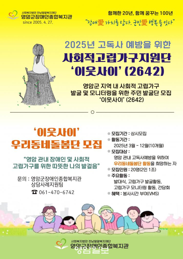 ÀÌ¿¡ ¿µ¾Ï±ºÀå¾ÖÀÎÁ¾ÇÕº¹Áö°üÀÇ »çȸÀû°í¸³°¡±¸Áö¿ø´ÜÀº ¡°ÀÌ¿ô»çÀÌ(2642) ¿ì¸®µ¿³×µ¹º½´Ü¡±À» ¸ðÁýÇϰí Àִµ¥ ¿µ¾Ï±º °ü³» °íµ¶»ç ¿¹¹æÀ» À§ÇÏ¿© ¿ì¸®µ¿³×µ¹º½´Ü Ȱµ¿À» Èñ¸ÁÇÏ´Â Áö¿ª¹ÎµéÀ» Áö¿øÀ» ±â´Ù¸®°í ÀÖ´Ù.